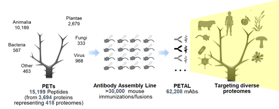 抗体作为一类重要的生物亲和试剂,在生命科学研究和医学相关研究中不可或缺。在高通量核酸测序技术的强大测序能力的推动下,目前已有大量物种的基因组被完全测序。针对这些物种,需要大量的抗体来推动后续研究。但常规抗体制备技术费时,费力且耗费不菲,一般一次只能制备一种抗体,无法满足在较短的时间内获得大量抗体的迫切需求。针对上述需求,本文开发了一款包含62,208种单克隆抗体的超高通量抗体芯片,并利用抗体的多特异性(multi-specificity)去发现和寻找新抗体。该芯片被成功验证可用于快速蛋白抗体制备、蛋白质组水平的抗体组制备、表型相关蛋白质筛选以及肿瘤药物靶向蛋白的发现等多种不同目的应用。这些单克隆抗体的免疫原来自400+类物种的3,000+种蛋白质的15,000+个线性表位,通过上万只小鼠的免疫、骨髓瘤细胞融合和筛选,最终形成了一个具有高度多样性,包含62,208种单克隆抗体的超大容量抗体库(图一)。