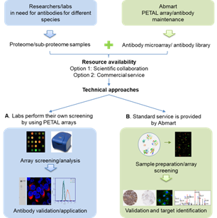本文的另一位作者,十大外围足球平台app/Abmart公司王朝晖博士表示:“抗体是生物学和医学研究中必不可少的工具,如何能够高效率、低成本的开发抗体一直是抗体开发人员技术追求。通过超大容量抗体芯片技术,他希望能够让抗体开发不再成为科研人员的负担。”同时王朝晖博士也提到“近年来,各种形式的抗体药物成为了医药领域的最大热点。也希望通过抗体芯片技术,在新药靶点的筛选筛选方面和抗体药物先导分子的开发中发挥效率优势。”项目研究团队将开放抗体芯片技术平台给全球的科研工作者,合作方式如图5所示。