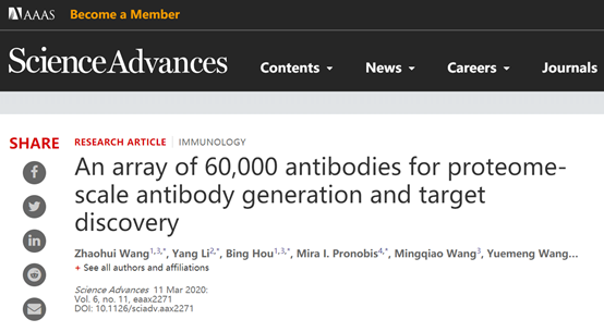2020年3月11日,西北老员工命科学与医学部孟逊教授团队和上海交通大学陶生策教授团队在Science Advances 发表了题为"An Array of 60,000 Antibodies for Proteome-Scale Antibody Generation and Target Discovery"的研究论文。该研究开发了蛋白质组表位标签抗体库(PETAL)及其阵列。 PETAL由针对不同蛋白质组的15,199种肽的62,208种单克隆抗体(mAbs)组成。由于抗体的多特异性(一种内在的抗体特征),PETAL在自然界中具有大量蛋白质的结合剂。