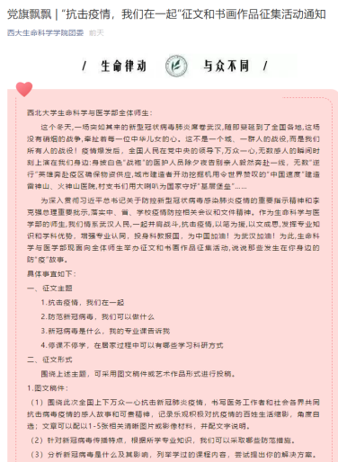 2月以来,学部积极发挥党团组织作用,先后开展"飘扬党旗守初心 抗击疫情担使命"的线上专题党日活动、“打赢抗疫攻坚战,青春力量在行动”主题团日活动。 “抗击疫情,我们在一起”征文和书画作品征集活动,以抗疫感人事迹培养同学们的家国情怀,激励同学们的爱国情报国志。