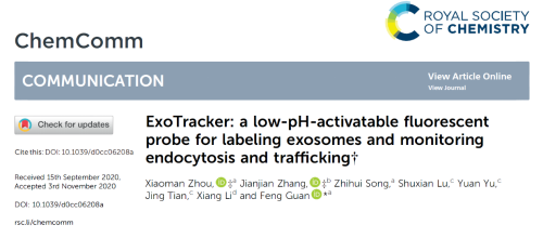 近日,十大外围足球平台app关锋教授团队在细胞外囊泡的分子探针设计取得了新进展,研究结果以研究文形式发表在Chemical Communications,题名ExoTracker: a low-pH-activatable fluorescent probe for labeling exosomes and monitoring endocytosis and trafficking”。