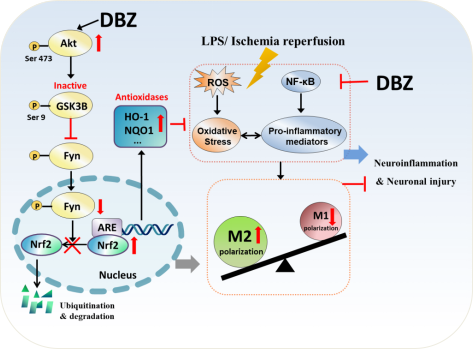 小胶质细胞介导的神经炎症在缺血性脑损伤等众多神经系统疾病发生发展中发挥着关键性作用,然而目前缺乏有效治疗药物,因此针对此类疾病药物研发具有迫切的临床需求。我们前期研究发现,小分子化合物丹参素冰片酯(DBZ)具有抗炎及抗动脉粥样硬化活性,但迄今为止其对中枢神经系统的作用未知。本研究旨在从小胶质细胞介导的神经炎症角度,考察DBZ对缺血性脑损伤的保护作用及其机制。研究表明,DBZ可显著抑制原代小胶质细胞及BV2小胶质细胞中核转录因子NF-кB活性及促炎介质的产生,且显著上调抗炎介质的表达;DBZ还可通过促进Nrf2的核内聚集及转录活性、增加抗氧化酶HO-1NQO-1的表达、抑制LPS诱导的胞内ROS产生等环节发挥抗氧化活性;沉默Nrf2的表达可显著减弱DBZ的抗神经炎症活性及抗氧化活性。整体动物水平研究表明,DBZ可显著减轻神经炎症小鼠的神经症状;更为重要的是,DBZ可显著缩小脑缺血再灌注模型大鼠的脑梗死体积,并改善其运动及认知功能;同时,DBZ可促进梗死半暗带小胶质细胞的形态恢复,并诱导其从促炎M1型向抗炎M2型极化。体内、外机制研究均表明,DBZ促进Nrf2的核内聚集进而发挥抗氧化抗炎活性,与其促进Akt(Ser473)位点及GSK3β(Ser9)位点磷酸化从而抑制Fyn激酶入核,进而抑制Nrf2的外排降解有关。抑制Akt激酶或活化其下游GSK3β激酶均可显著增加小胶质细胞内Fyn激酶的水平,加速Nrf2的外排降解,从而显著减弱了DBZ的抗神经炎症及抗氧化活性。综上研究结果证实,DBZ的抗脑缺血损伤活性及其对小胶质细胞介导的神经炎症的调控作用,与Akt(Ser473)/GSK3β(Ser9)/Fyn通路介导的Nrf2在核内的积累及稳定性密切相关;DBZ具有被进一步开发成为抗脑缺血损伤及其他神经炎症相关疾病治疗药物的巨大潜力。