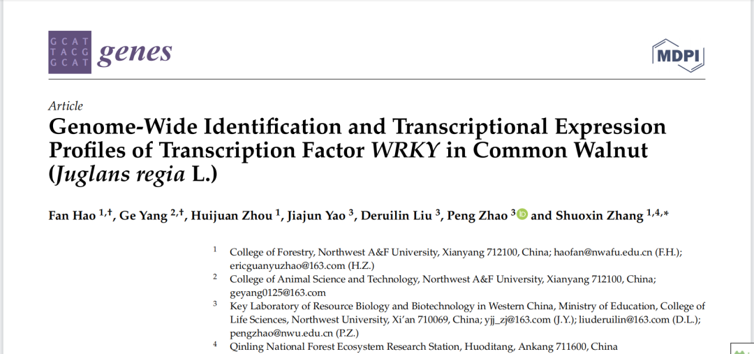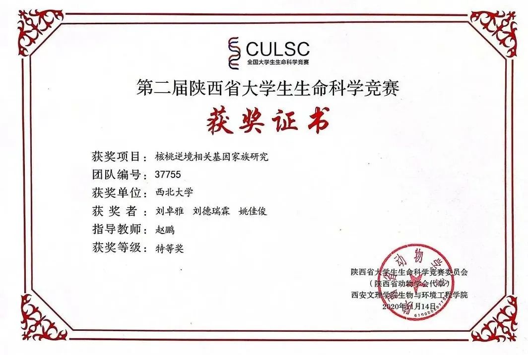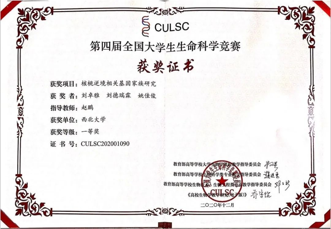 同为赵鹏老师课题组的本科生,姚佳俊和刘德瑞霖对核桃逆境相关基因家族进行相关研究,凭借该项目成功获得第二届陕西省老员工生命科学竞赛特等奖暨第四届全国老员工生命科学竞赛一等奖,并分别以第四、第五作者的身份在genes期刊上发表文章。