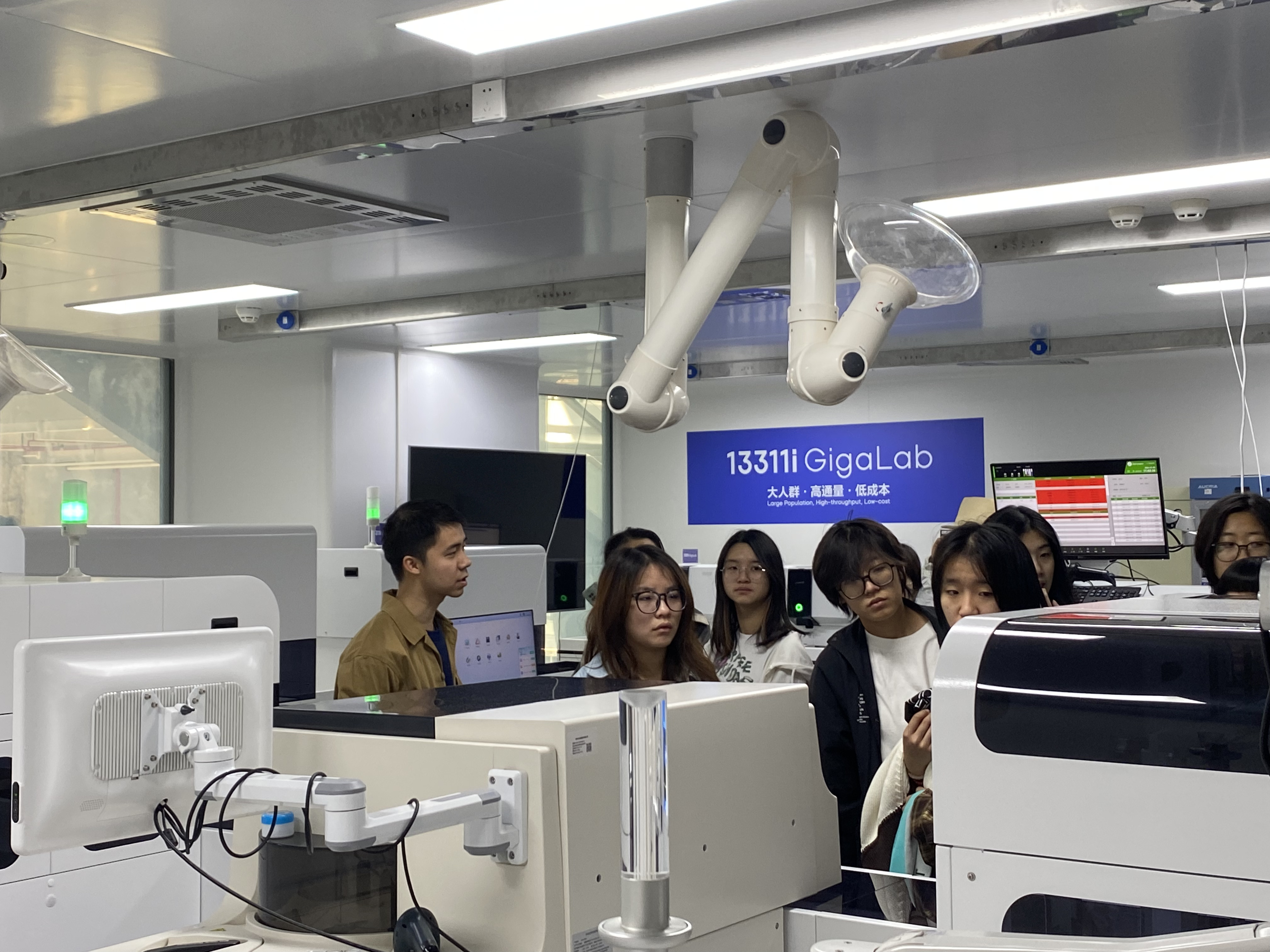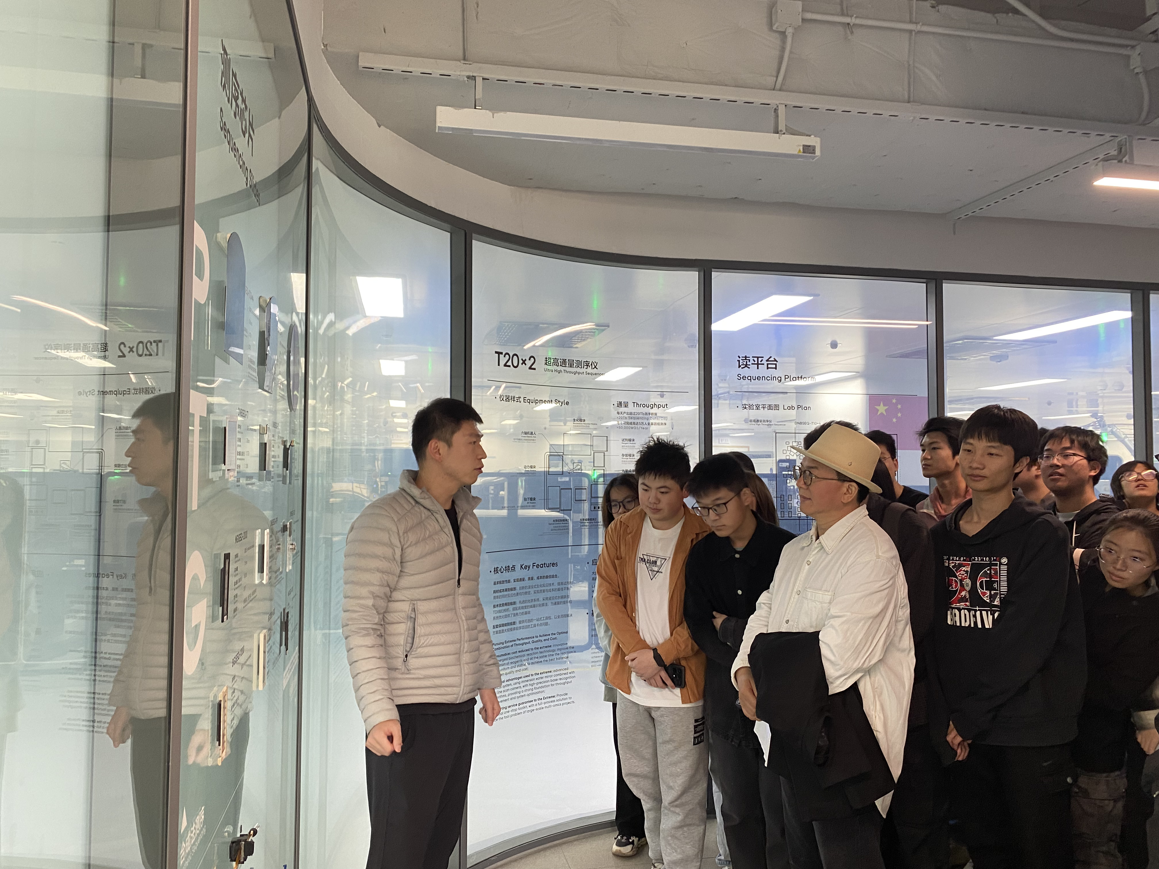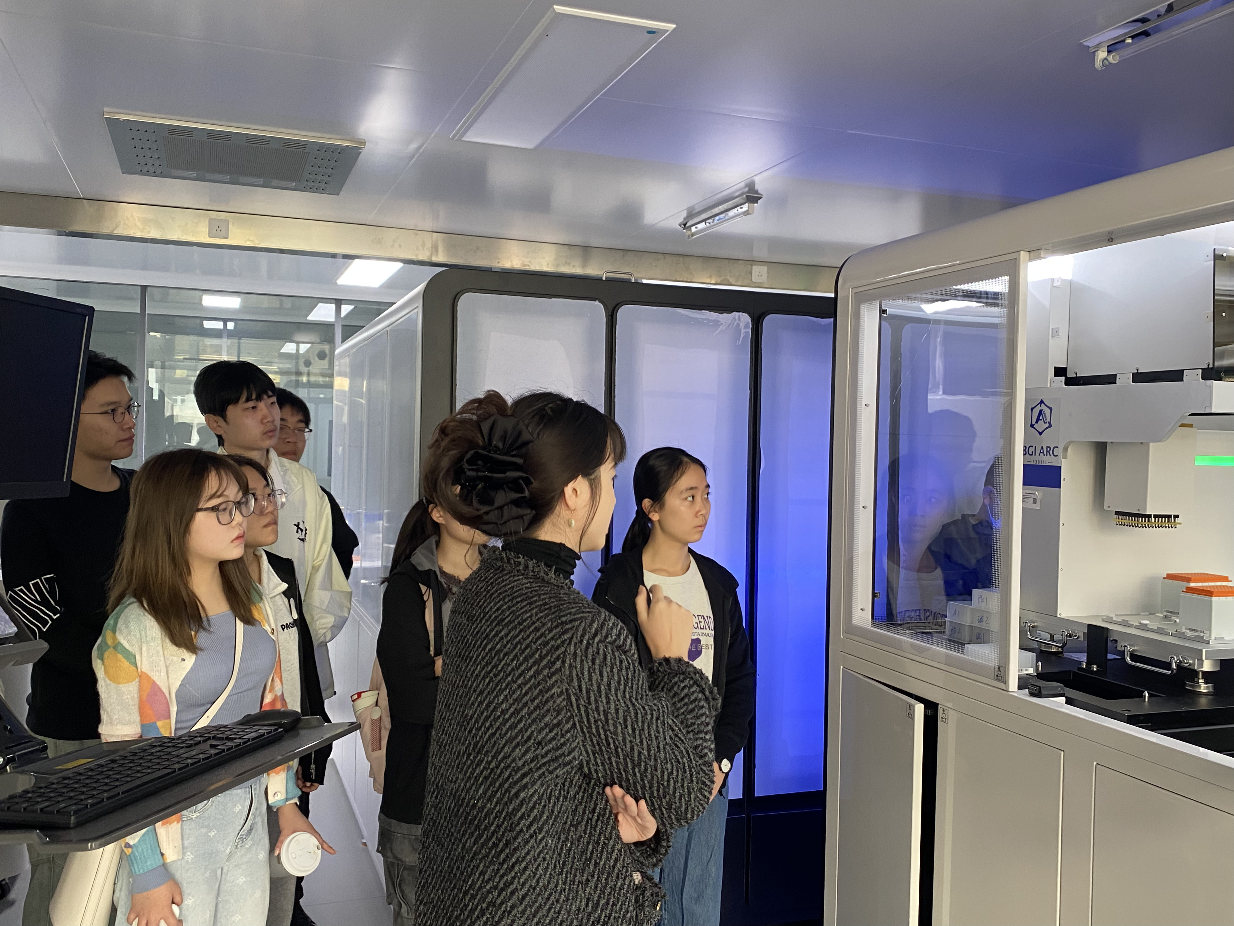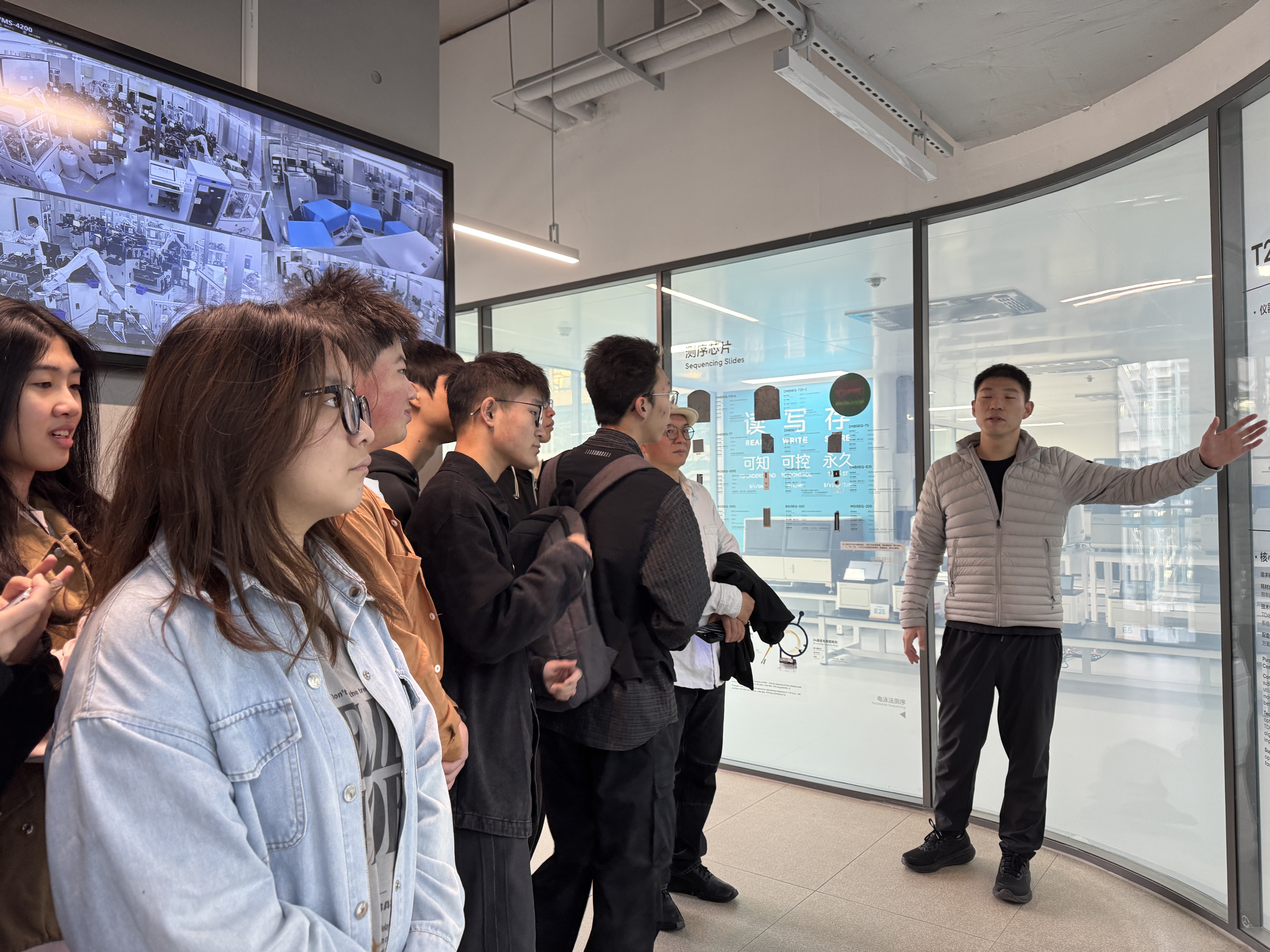 在深圳华大时空中心近距离了解和体验华大集团在生命科学领域的先进技术和应用。华大教育中心丁林老师先向同学们介绍华大集团的发展历程和研发成果。随后,同学们通过互动讨论和实地观察,一同参观了华大基因的长读长测序平台、自动化实验室等重要研究场所,深入了解了基因测序领域的技术和设备的飞速发展史。