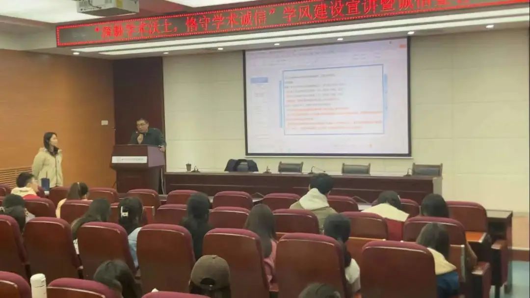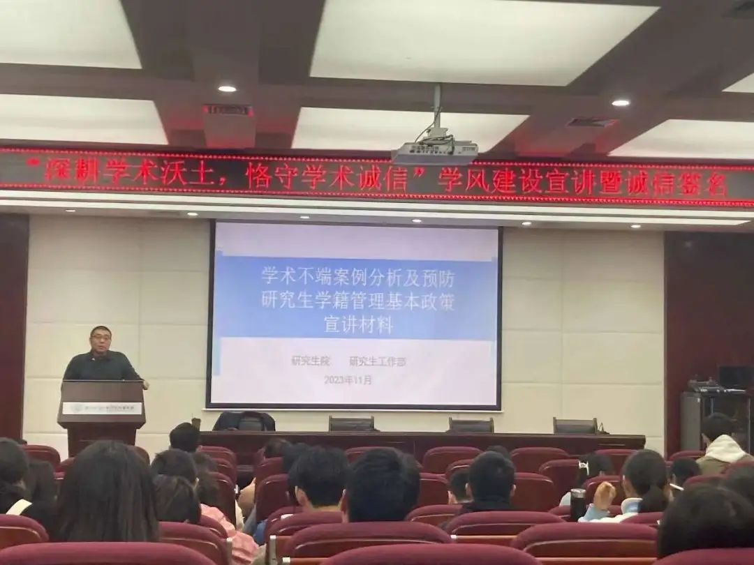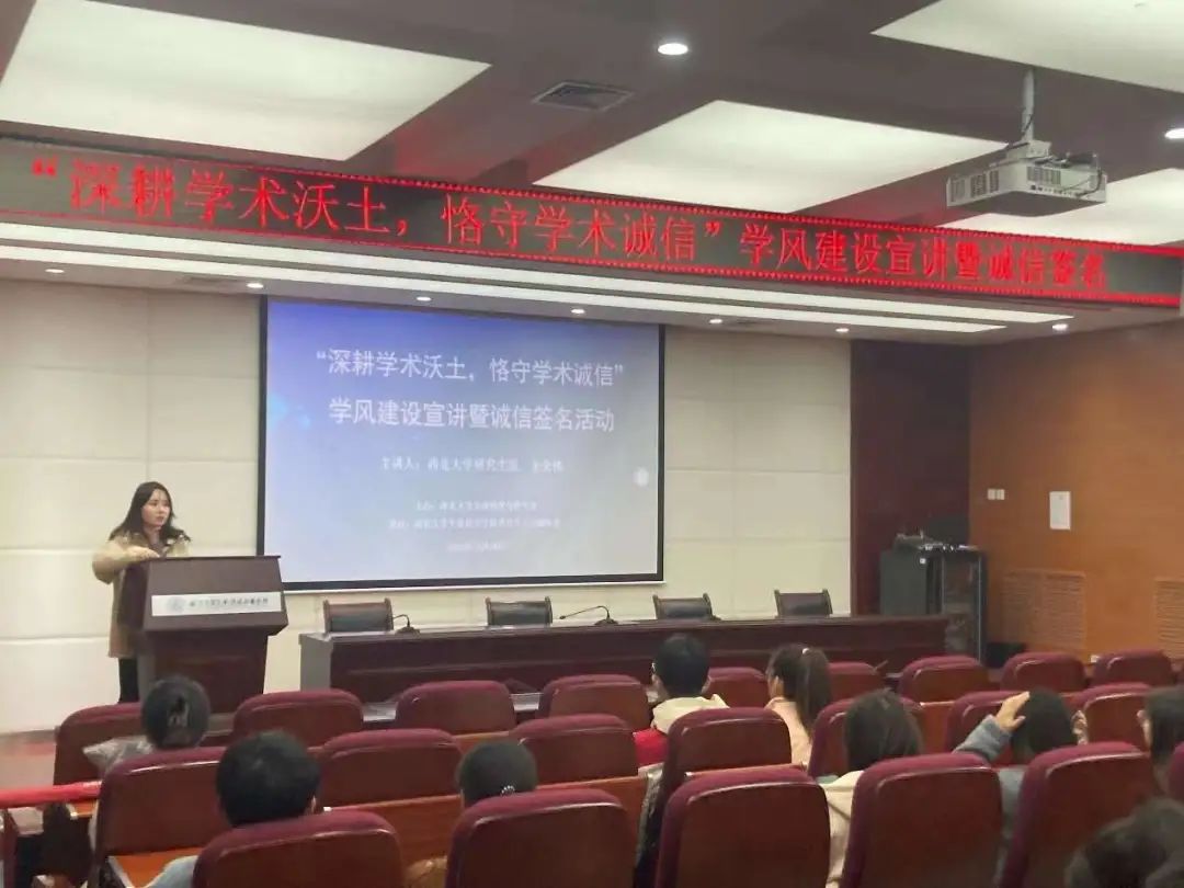 11月10日下午,第十七届学术月——“深耕学术沃土,恪守学术诚信”学风建设宣讲暨诚信签名活动在博望报告厅举行,邀请研究生院教育管理办公室主任王全伟老师作学风建设专题报告,开展学术诚信签名活动,一百多位研究生参加,活动由辅导员郭佳惠老师主持。