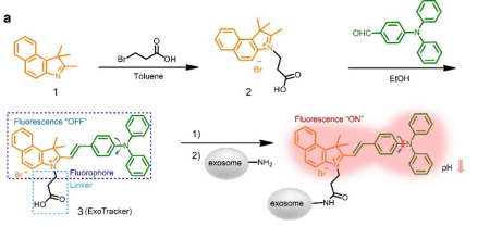 目前对于胞外囊泡的标记方法包括使用亲脂性的染料(如:PKH-67/PKH-26Dil/DiD/DiO/DiR),膜渗透性型的化合物(如:CFSE/CFDA/Calcein-AM),以及基于胞外囊泡表面巯基基团的荧光标记等。这些标记方法存在不足,一是由于染料多以非共价方式嵌入胞外囊泡的膜双层,导致染料与外泌体相似的水溶液中形成染料聚集体或团块;二是染料标记之后对被标记物带来结构上的修饰,可能影响其功能;三是大部分染料在酸性环境下荧光信号很弱。十大外围足球平台app关锋教授团队敏锐地观察到上述标记方法的不足,该团队与十大外围足球平台app化学与材料公司张健健副教授合作设计合成了一种pH敏感型的探针分子(图1)。