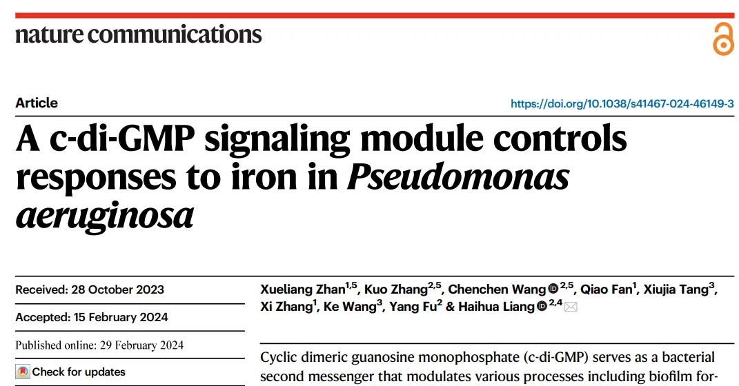 参考文献:Zhan Xueliang. et al. A c-di-GMP signaling module controls responses to iron in Pseudomonas aeruginosa. Nat Commun, 2024, 15, 1860