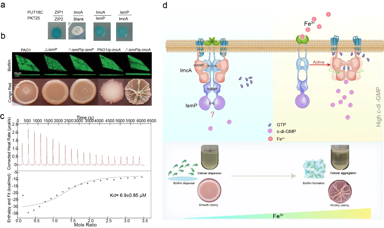 研究团队首先探究了ismP基因在铜绿假单胞菌中的功能,发现其缺失或过表达对细菌的生物膜形成和运动性影响不显著。进一步利用细菌双杂交系统(BTH)筛选出IsmP的互作蛋白,并通过微量热泳动(MST)和蛋白质共纯化实验验证了相互作用,发现IsmP抑制ImcA的c-di-GMP合成酶活性。接下来,使用等温滴定量热法(ITC)确定了IsmP的CHASE4结构域与铁离子的直接相互作用。实验结果显示,铁离子能解除IsmP对ImcA的抑制从而激活了ImcA的活性。通过X射线晶体学和冷冻电镜技术解析了IsmP的CHASE4结构域和ImcA的结构,揭示了细菌感知并响应环境铁离子的分子机制。十大外围足球平台app2021级博士研究生詹学良为第一作者,梁海华教授为通讯作者。该研究得到了国家自然科学基金和科技部重点研发项目的资助。