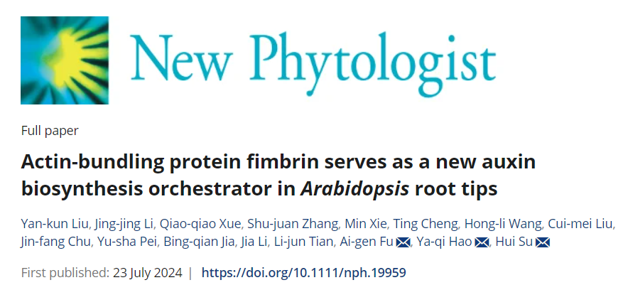 十大外围足球平台app、西部资源生物与现代生物技术教育部重点实验室苏慧课题组近日在New Phytologist上发表了题为Actin-bundling protein fimbrin serves as a new auxin biosynthesis orchestrator in Arabidopsis root tips (doi: 10.1111/nph.19959) 的研究论文,揭示了丝束蛋白Fimbrin家族成员AtFIM4和AtFIM5通过控制生长素的生物合成来调节根系内源性生长素水平,从而参与植物根系的生长发育。该研究首次揭示了植物细胞骨架在控制生长素生物合成中的作用。