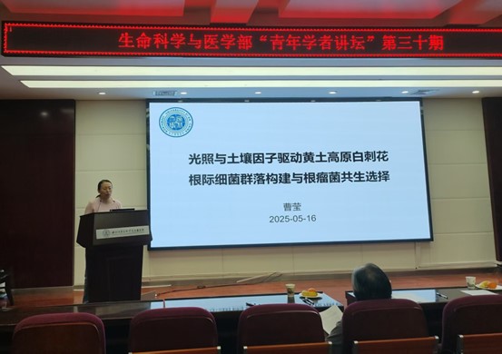 曹莹老师在本次交流活动中作题为《光照与土壤因子驱动黄土高原白刺花根际细菌群落构建与根瘤菌共生选择》的学术报告,研究聚焦于黄土高原典型豆科植物白刺花,探索其如何在不同光照与土壤条件下调控根际微生物群落构建及共生菌筛选,为退化生态系统恢复提供了微生物生态学新视角。