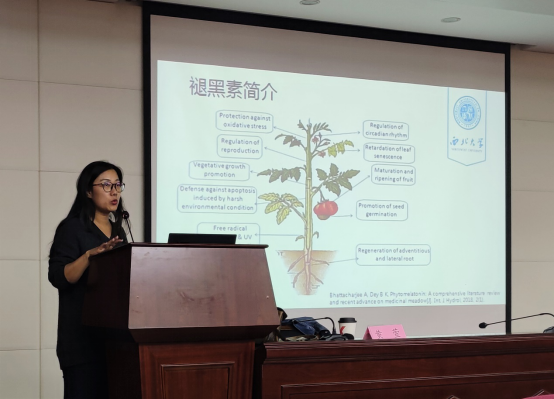 黄萱副教授以“褪黑素在植物中的功能研究”为报告题目,介绍了褪黑素在植物中的功能,分享了“UV-B照射下褪黑素对UV-B通路的影响”、“内外源褪黑素对拟南芥生物种及相关生理活动的影响”等研究过程。