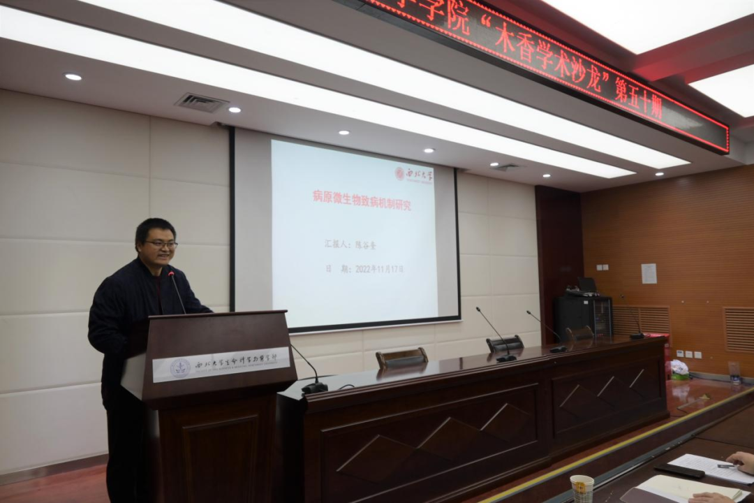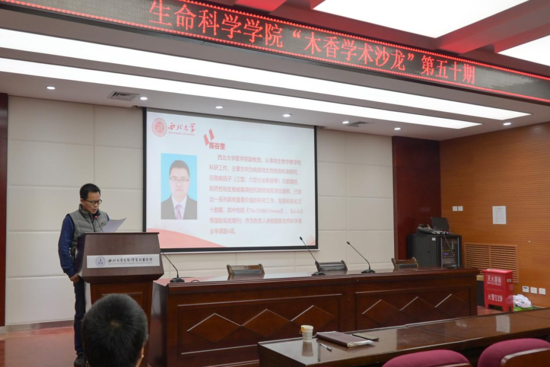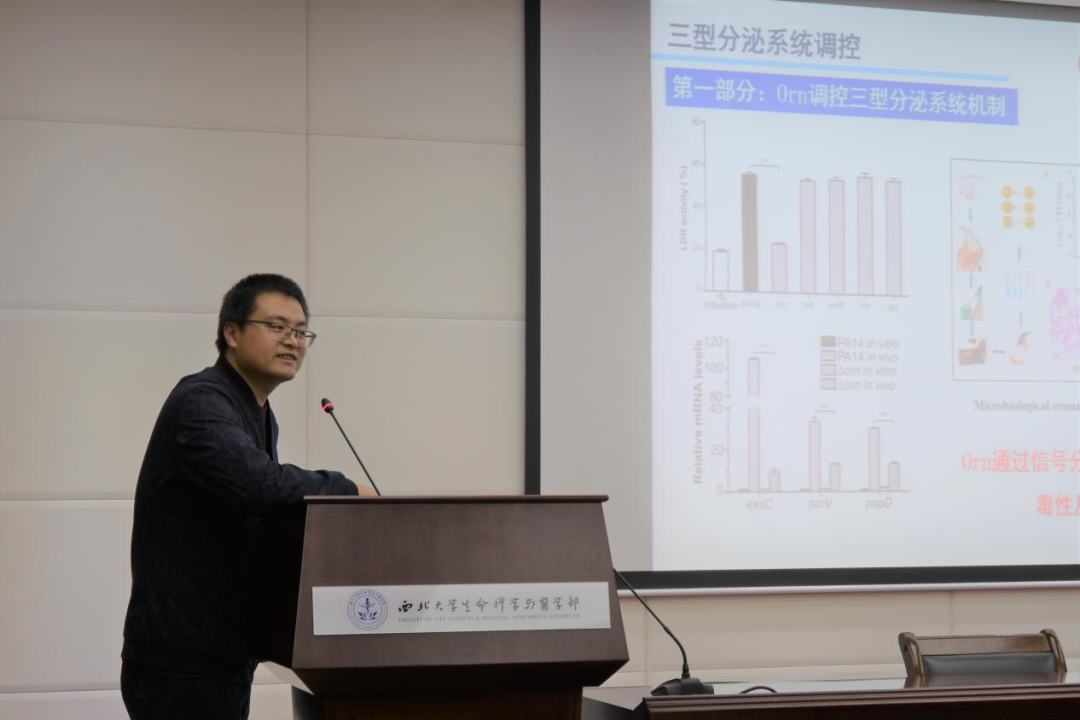 随后,陈谷奎老师介绍了SiaC激活SiaD的分子机制以及三型分泌系统调控。通过氨基酸点突变验证了SiaD活性位点,利用结构生物学解析出SiaC和SiaD复合体状态,SiaC能与SiaD直接结合,通过改变SiaD蛋白构象,激活其酶活性。三型分泌系统由细菌的内膜,外膜和真核细胞的细胞膜构成,将细菌产生的毒蛋白通过跨膜孔道注入到正常细胞中,使细胞产生毒性。目前发现Orn能通过信号分子cAMP调控细菌毒性及致病性,CysB通过直接调控RetS调控三型分泌系统。