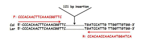 本实验选用的 Indel 分子标记位于 3 号染色体上,在生态型 Col 上有一个 121 bp 的插入序列,使用特异引物(位于插入位点上下游的单拷贝序列)扩增后,在 Col 和 Ler 两种生态型中的扩增条带大小分别为 511 bp 和 390 bp,序列信息示意图如下: