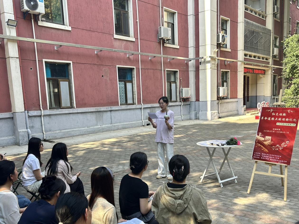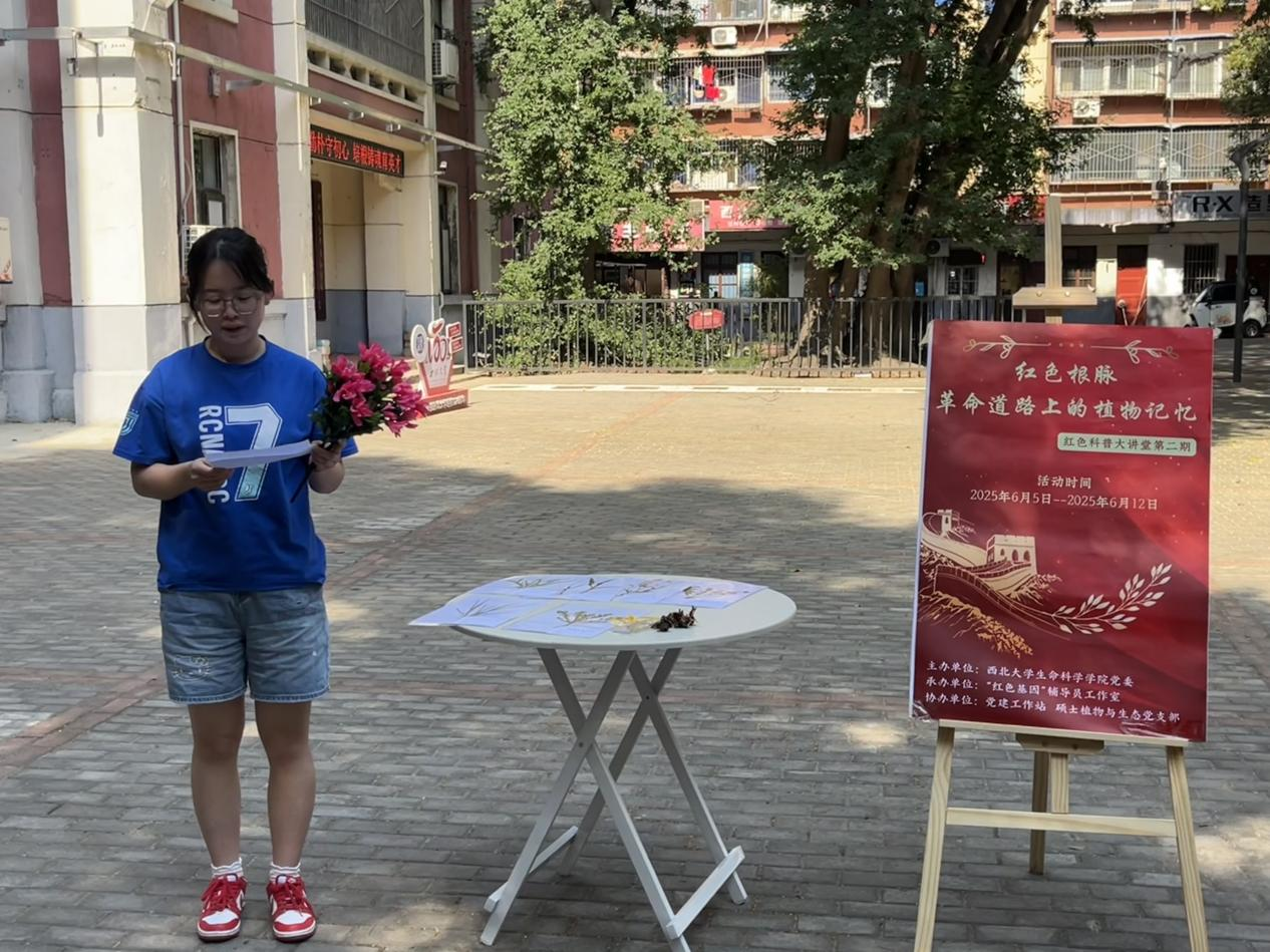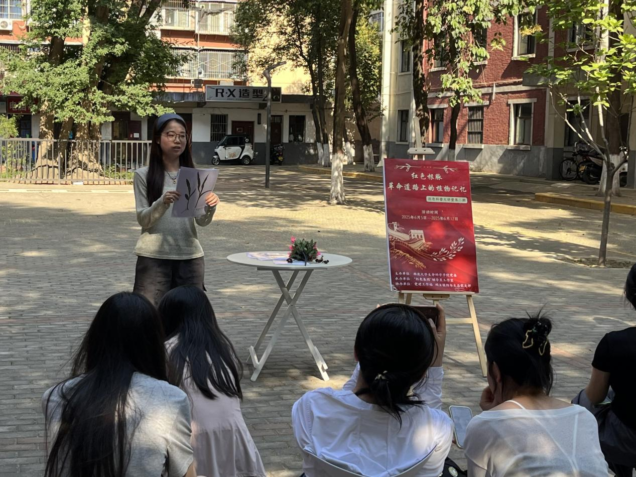 为深入学习贯彻习近平新时代中国特色社会主义思想和党的二十大精神,持续推动党史学习教育常态化长效化,将红色文化与生态教育深度融合,6月12日,由西北老员工命科学公司党委主办,“红色基因”辅导员工作室承办,党建工作站、硕士植物与生态党支部协办开展的“革命道路上的植物记忆”红色科普大课堂活动,在太白校区生活记忆馆前皂角树广场举行。