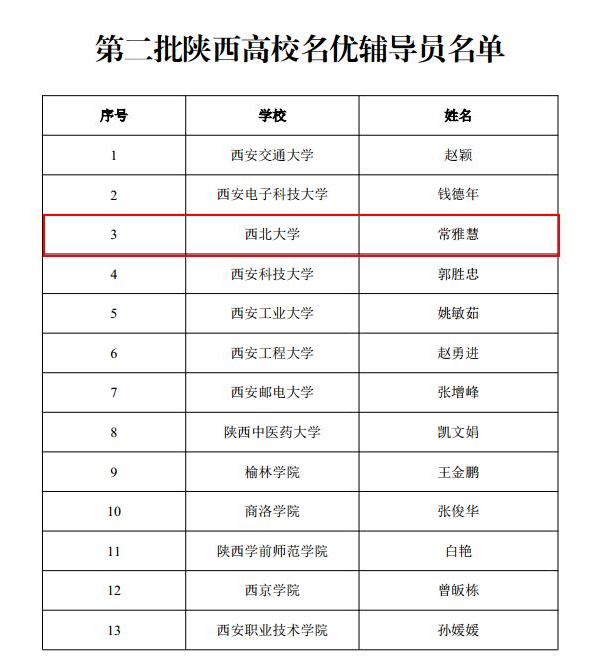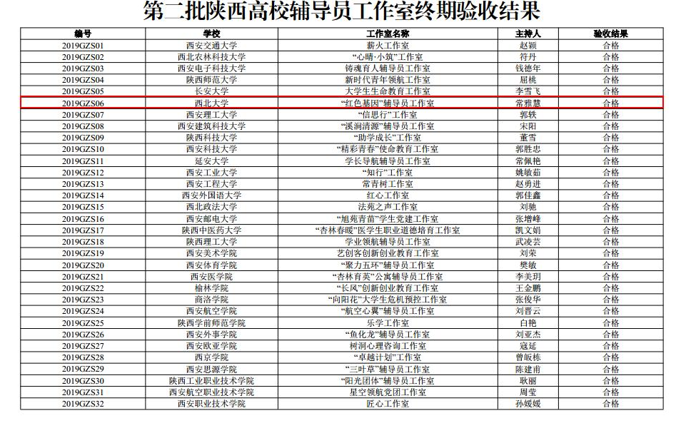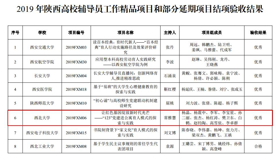 近日,省委教育工委下发《中共陕西省委教育工委关于公布第二批陕西高校辅导员工作室终期验收结果和2019 年陕西高校辅导员工作精品项目结项验收结果的通知》,公司“红色基因”辅导员工作室顺利通过验收,被授予“陕西高校省级辅导员示范工作室”,常雅慧荣获“陕西高校名优辅导员”称号,精品项目《让红色基因绽放新时代光芒——“123”党建进公寓育人模式的探索与实践》被评为优秀验收成果。