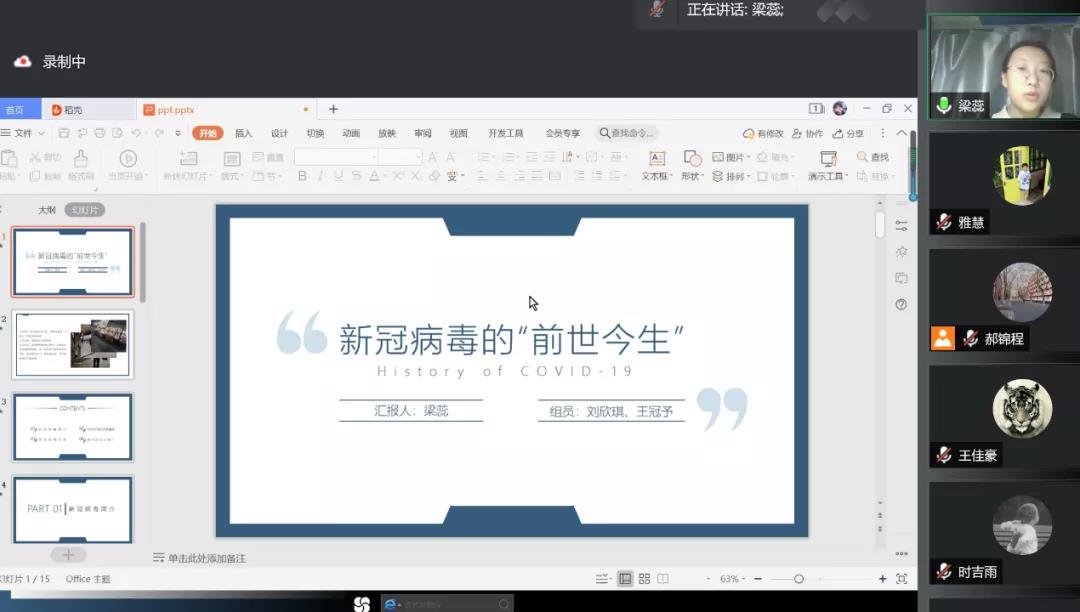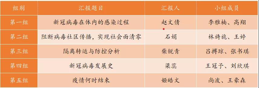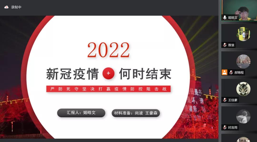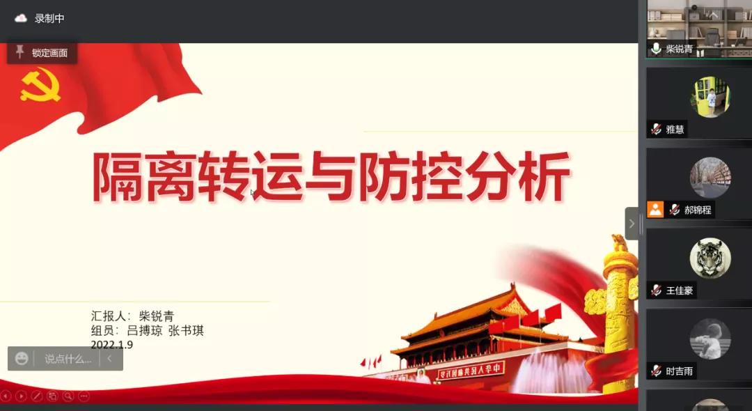 会议开始,“筑梦先锋”本科生党支部党员郝锦程向与会人员介绍了西安疫情防控最新进展。随后15名党员分成5组进行学习汇报。汇报围绕“新冠病毒在体内的感染过程”、“阻断病毒社区传播,实现社会面清零”、“隔离转运与防控分析”、“新冠病毒发展史”、“疫情何时结束”五个主题展开,重点讨论了新冠病毒的构成及入侵方式、阻断当前病毒社区传播途径的实施措施、严格防控的必要性和合理性、新冠病毒的“前世今生”以及新冠疫情怎样才算结束等热点问题,学以致用引导同学们全面科学理性地看待本轮疫情,凝聚众志成城、同舟共济的强大正能量。