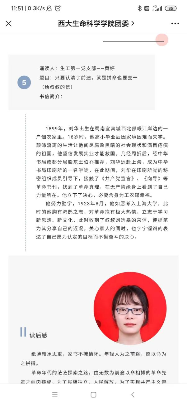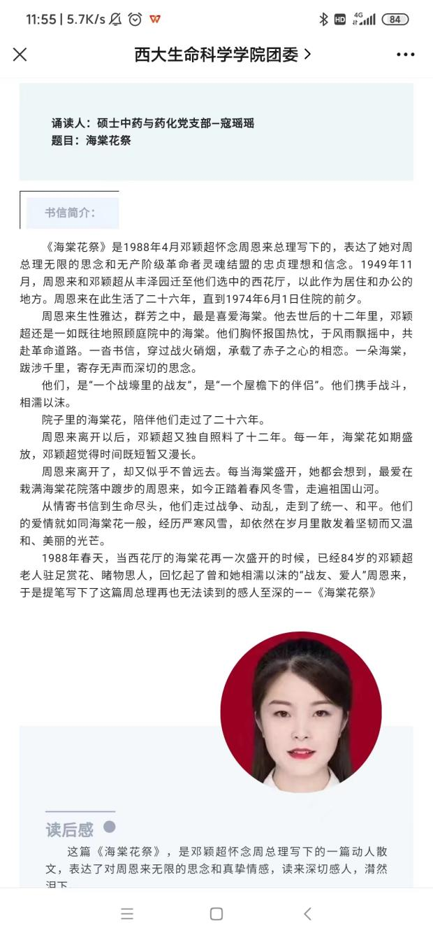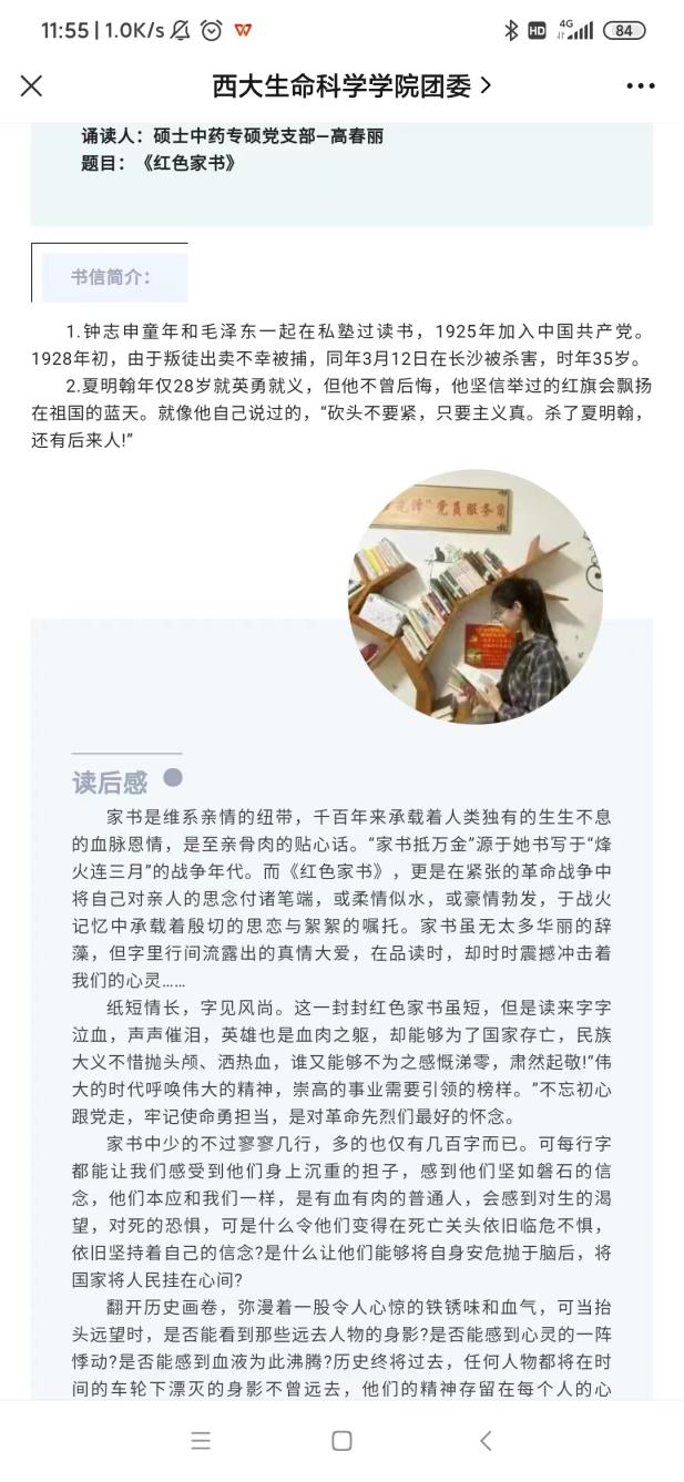 本次活动于3月下旬启动,通过“红色家书”诵读音频征集、推送展示、集体诵读会、征文等多种形式以情抒志、以书托思,多样化、创新性的开展红色家书学习宣传教育活动。围绕活动主题“红色家书,永恒不变的初心”,60余名师生党员参与学家书、诵家书、议家书、悟家书、写家书,深入了解了革命先辈刻骨铭心的英雄事迹和峥嵘岁月,深刻体会了共产党员和革命战士崇高的理想和坚定信念,以及中国共产党为争取民族独立、人民解放和国家富强、人民幸福进行的奋斗历程。在集体诵读会上,与会党员共同学习了《习近平给父亲的一封生日贺信》,从学习做人、学习做事、学习对信仰的执着追求、学习赤子情怀、学习生活俭朴五个方面进行深入解读。12名党员代表深情诵读了杨开慧、彭雪枫、赵一曼等革命先烈的“红色家书”,一封封浸透着硝烟和血泪的红色家书,犹如一段段波澜壮阔的革命史诗,在党员声情并茂地诵读中浮现眼前,讲述了人间大爱,传递了革命大义,让师生党员深刻体会了革命先烈崇高的家国情怀和矢志不渝的坚定信仰。
