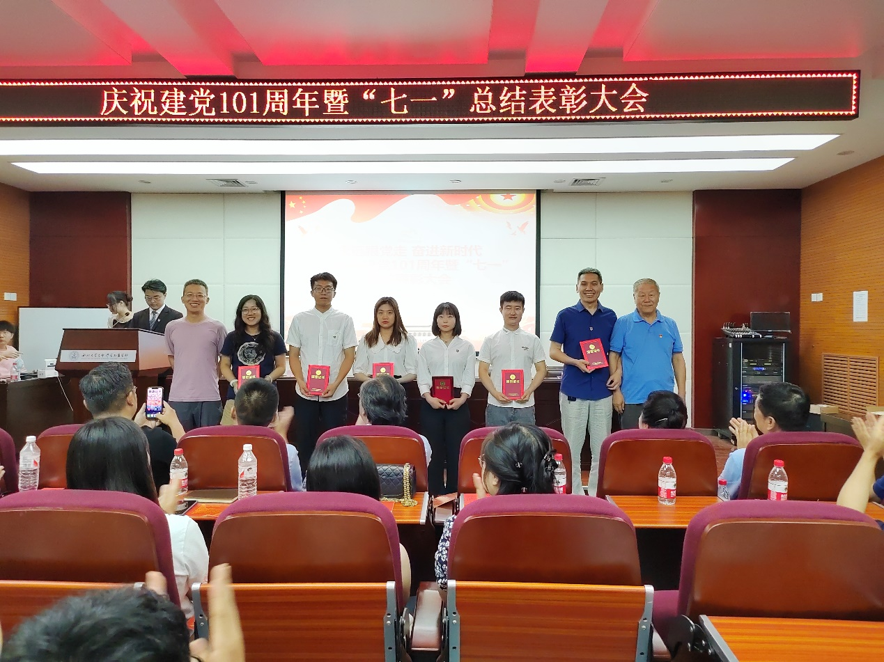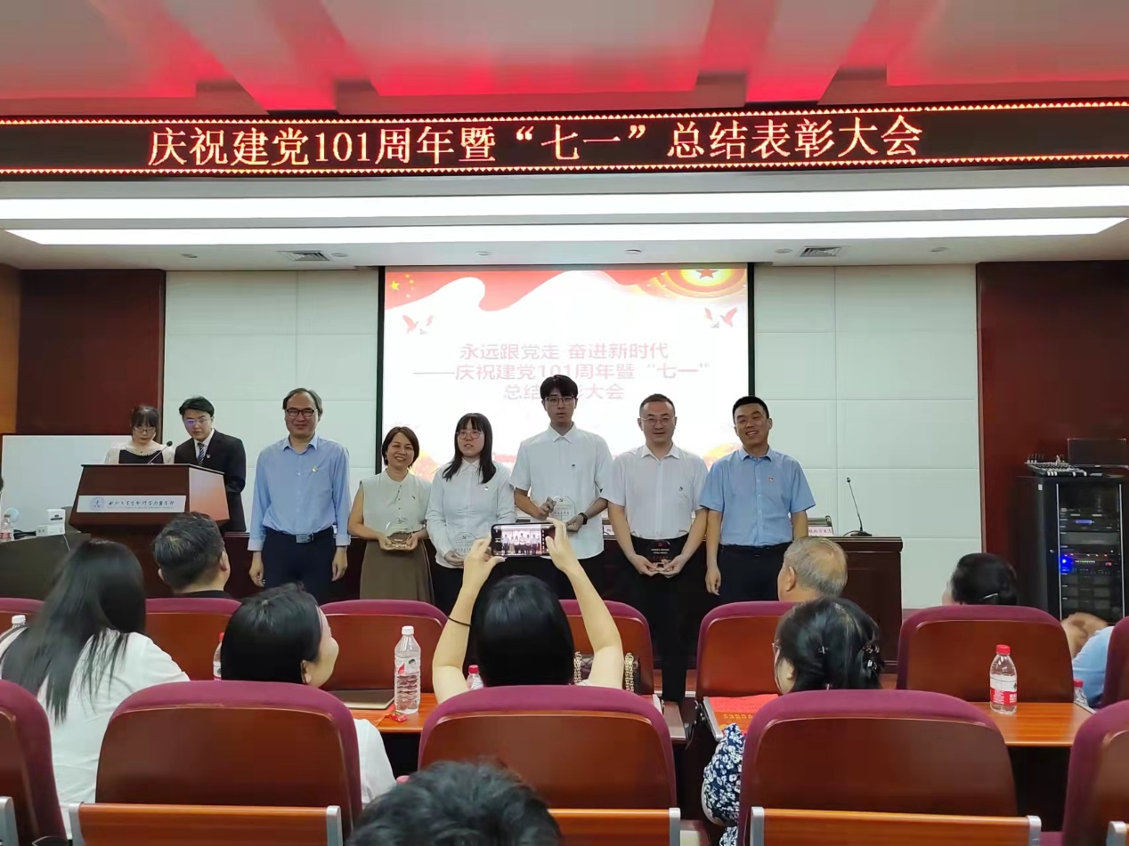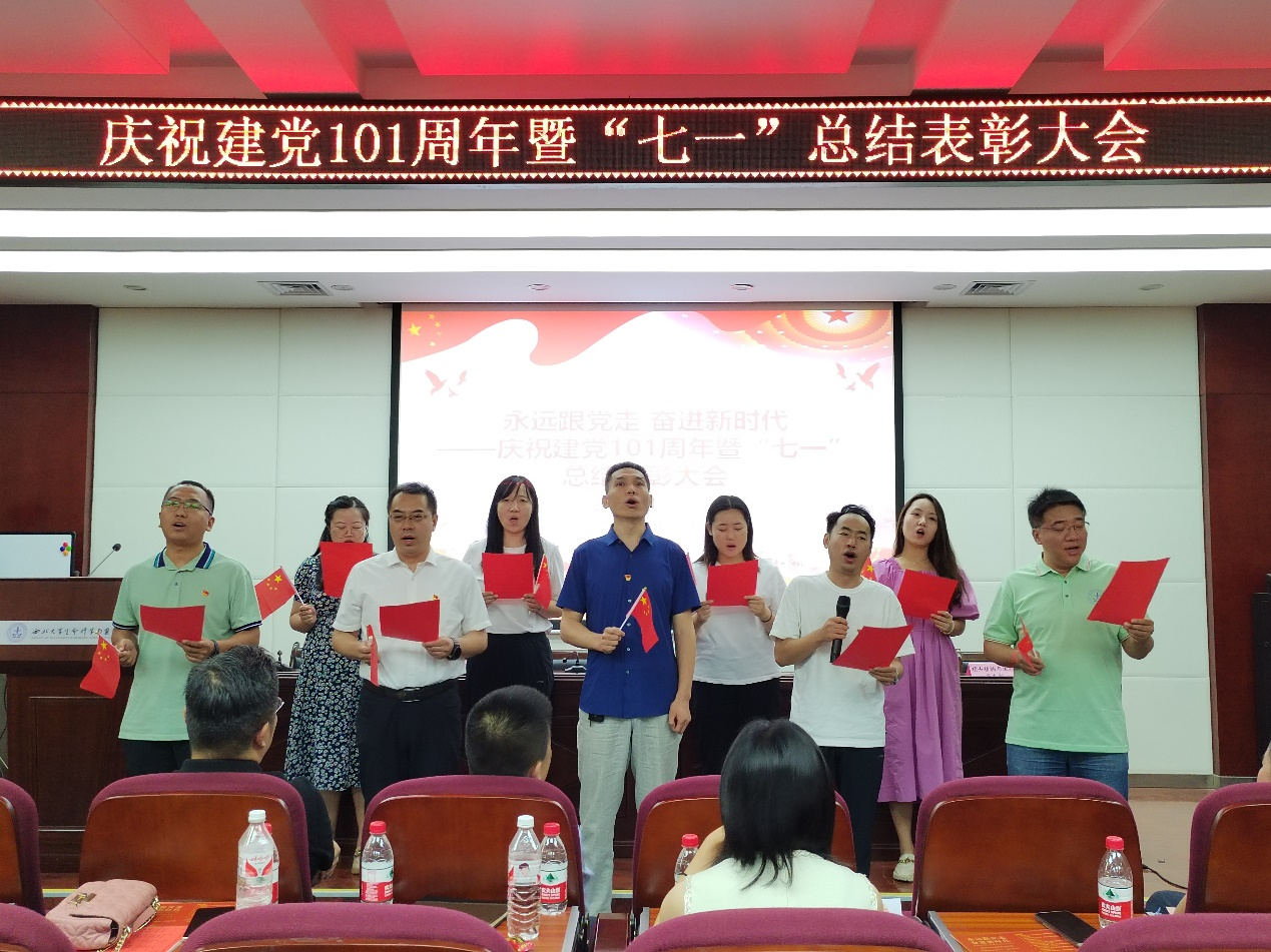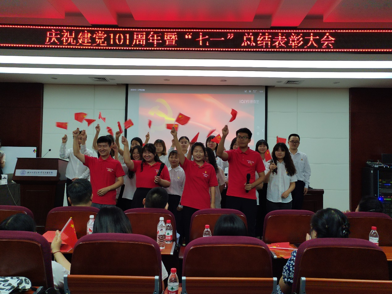 会议最后,教工行政教辅党支部和员工党务工作站分别表演合唱《我和我的祖国》《错位时空》(五四特别版),用高亢嘹亮的歌声再现了中国共产党走过的波澜壮阔的百年历程,唱出对党的无限热爱和礼赞!