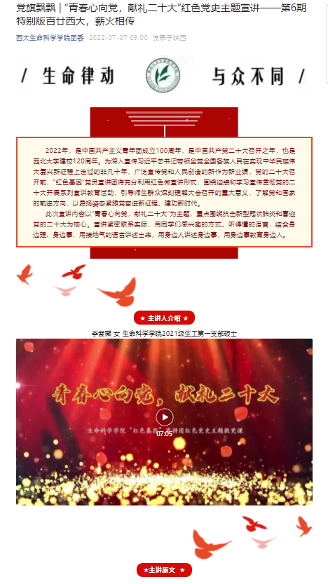 本次主题宣讲活动于2022年6月启动,采用“校内校外、线上线下”联动进行的微宣讲形,共开展主题宣讲10场,累计受众1000余人次。“红色基因”党员宣讲团围绕“传承‘红色基因’的时代价值” “红色基因’在他们身上传承”等五个主题,突出“小、实、活、精”特点,从一个小角度、一个小故事入手,以小见大、由此及彼,生动展现了党的十八大以来取得的原创性思想、变革性实践、突破性进展和标志性成果。宣讲团面向校内师生开展线上宣讲6场,通过精神解读、时事分析、身边典型、学习感悟等形式,用身边人讲述身边事,用身边事教育身边人,体会“我们这十年”的非凡成就。宣讲团暑假期间跟随公司“三下乡”实践团,前往佛坪县、宁陕县、岚皋县,面向基层群众、消防战士、护林人员开展理论宣讲4场,通过“今昔对比”“代际对照”等方式,运用群众最能接受的语言、最喜欢的方式讲述自己的小故事与国家的大故事。