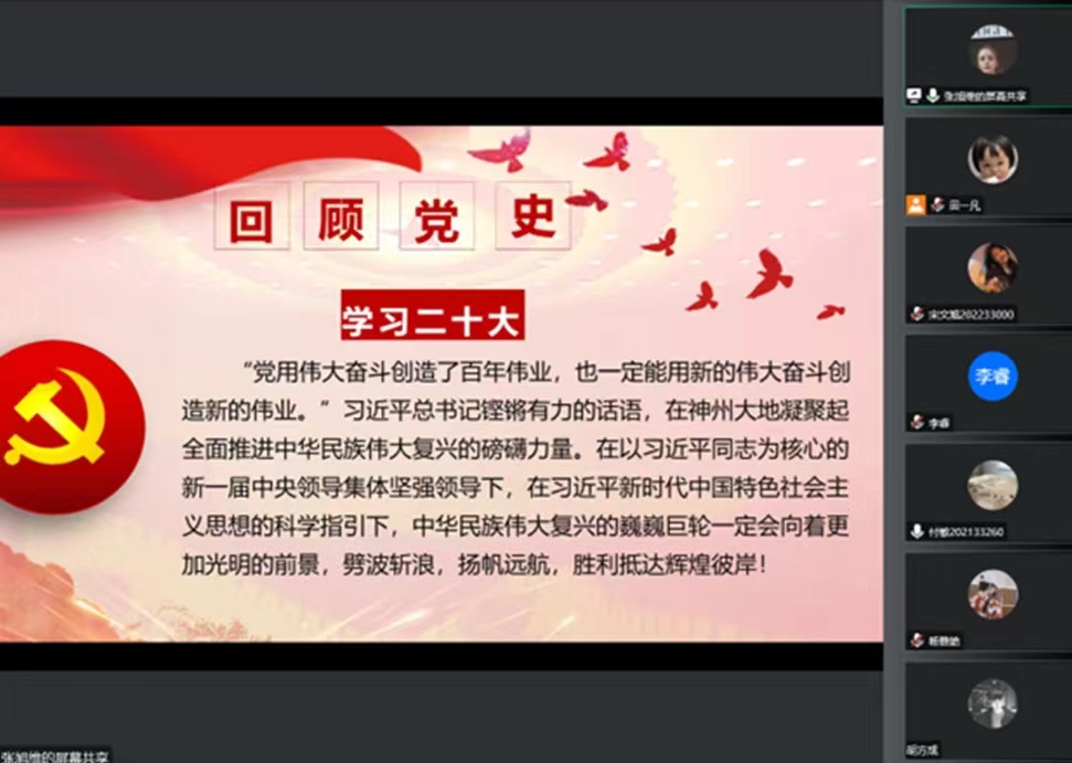 11月5日,硕士生物工程第一党支部线上开展“学党史忆初心,明校史担使命”主题党日活动,通过学习党史、回顾校史、学习榜样三个环节来学习宣传贯彻党的二十大精神,结合党史、校史教育推进党的二十大精神真正入脑入心。与会党员纷纷表示,日后将始终保持蓬勃朝气、昂扬斗志,在推进建设社会主义现代化强国的伟大实践中贡献自己的青春力量。接过时代的接力棒,传承公司红色基因,发挥主人翁精神,珍惜年华、求真务实,淬炼青春、踔厉奋发,以优异的表现与成绩向母校120年华诞献礼,庆祝党的二十大胜利召开!