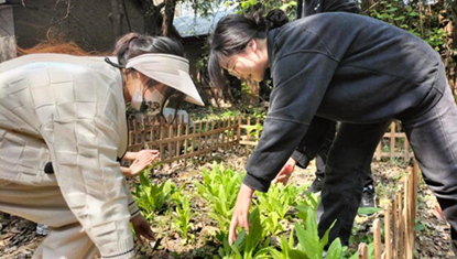 看到一株株油麦菜在风中摇曳,看到一颗颗油菜花在光下飞舞,原本荒凉的菜园居然变得这样生机勃勃、春意盎然,我们大吃一惊,这还是学姐口中的“荒凉”吗?我们干劲十足,按照分配好的工作,开始埋头苦干,顶着太阳,踩着湿湿的土地,弯身摘菜,一捆捆油麦菜被扎好,整整齐齐的放进袋子里,偶然的几滴汗滑进衣服里,也被满心的喜悦忽视,趁着大家都在休息的功夫,我观察着小小的花园看到旁边有刚刚插好的栅栏,翻新的土地,种上了种子,泛着泥土的清香,询问学姐后才知道“筑梦花园”是依照党旗图案设计,栽种着草本植物三色堇,期待它们像猫脸一样的花点缀着晚春的花坛,“草树知春不久归,百般红紫斗芳菲”。而 “筑梦菜园”,种植着油麦菜、红皮萝卜、豇豆,相信它们虽没有争奇斗艳的花园漂亮但这些蔬菜的蓬勃生长,不仅代表着菜园的新生,更是寄托着在这块土地挥洒过汗水的员工党员的希望。