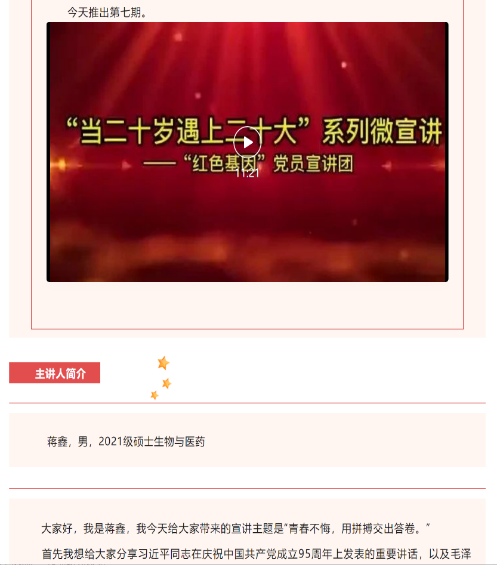 为深入学习宣传党的二十大精神,推进学习贯彻习近平新时代中国特色社会主义思想主题教育走深走实,团结带领广大青年奋进新征程、建功新时代,十大外围足球平台app“红色基因”党员宣讲团开展了“当二十岁遇上二十大”系列宣讲活动。