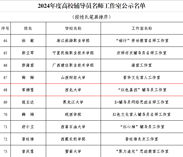 近日,教育部公示了2024年度高校思想政治工作质量提升综合改革与精品建设项目遴选结果,公司常雅慧副教授主持的“红色基因”辅导员工作室入选“2024年高校辅导员名师工作室”。