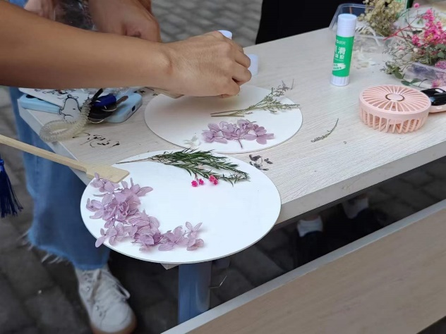 活动伊始,主持人为同学们介绍了此次活动的背景,同时详细讲解植物压花扇的制作方法。随后,参与同学分组开展手工制作,他们精心挑选植物材料,巧妙地运用“挑、粘、压”等技法,将一片片经过压制和干燥的植物标本,细致地铺展在扇面上,制作出一个个精美的植物压花扇子。每一件作品既展现了同学们的无限创意,又凝聚了他们对自然之美的体悟。活动尾声,同学们纷纷走上台前展示他们的创作成果,介绍了各自作品的创作理念,并分享创作过程中的乐趣与心得。此次活动吸引了近二百名同学积极参与,共收到87份充满创意与匠心的植物压花扇作品。