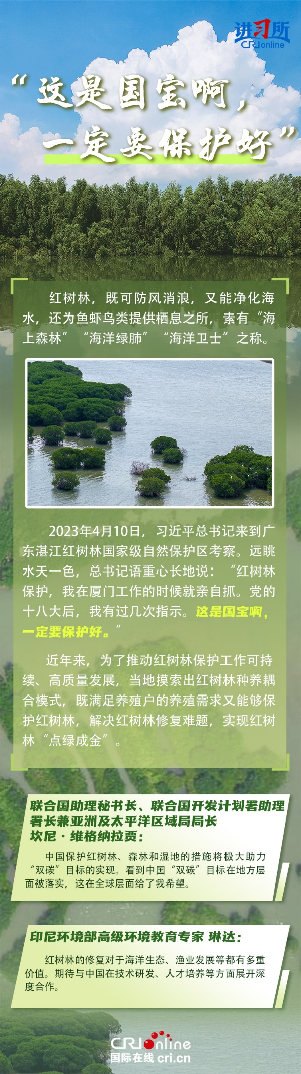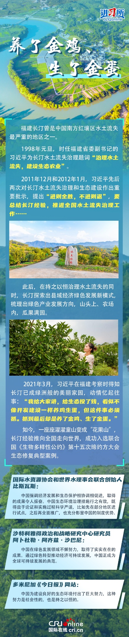 新时代以来,在习近平生态文明思想的科学指引下,“两山”理念已深入人心,从“点绿成金”的红树林到一座座“花果山”,再到走向世界的长汀经验……美丽中国建设迈出重大步伐,生态环境保护发生历史性变化。国际社会认为,中国取得广泛的绿色发展成就,从根本上源于习近平生态文明思想,特别是“两山”理念的指引。在通过绿色转型推动经济可持续发展方面,中国正成为全球可持续发展的典范。