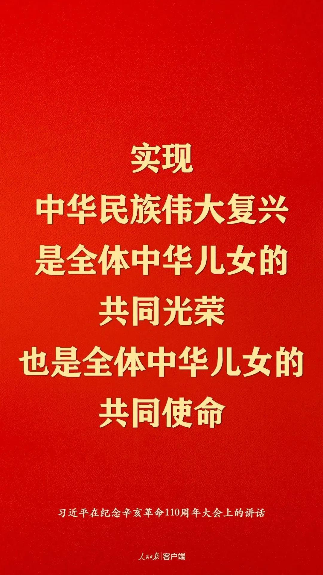 110年前爆发的辛亥革命,以其惊心动魄的时代伟力,打开了中国进步闸门,成为民族复兴伟大征程上一座巍然屹立的里程碑。今天,我们在向革命先辈致敬同时,必须以史为鉴,开创未来。特别是重温中国共产党人的爱国初心、壮志情怀和革命精神,以习近平新时代中国特色社会主义思想为引领,勤奋学习、开拓创新、团结拼搏,书写青年一代的华彩篇章。