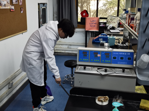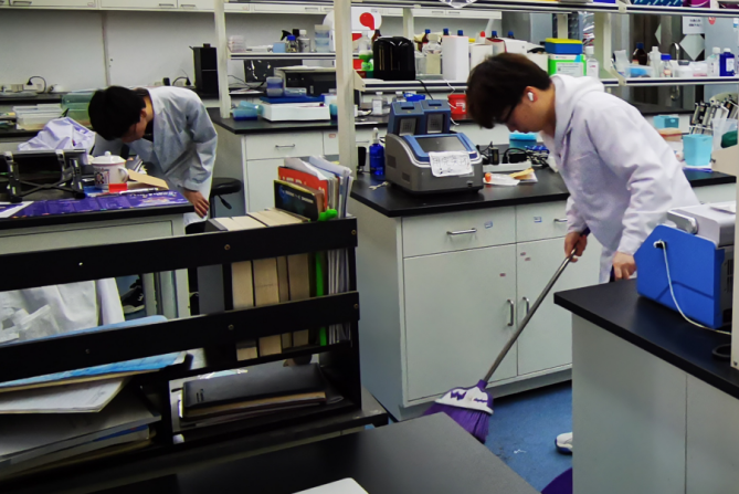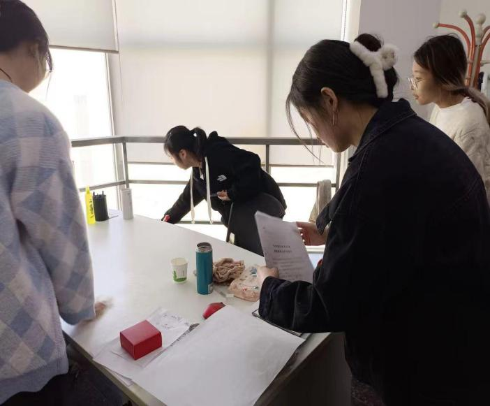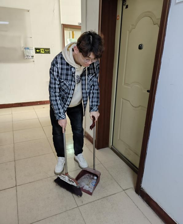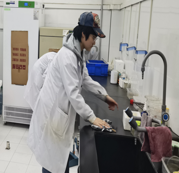 同学们还前往班主任实验室,擦拭实验物品、实验桌面、门框玻璃,清洗实验器具,清洁实验地面,共同维护舒心干净的实验环境。