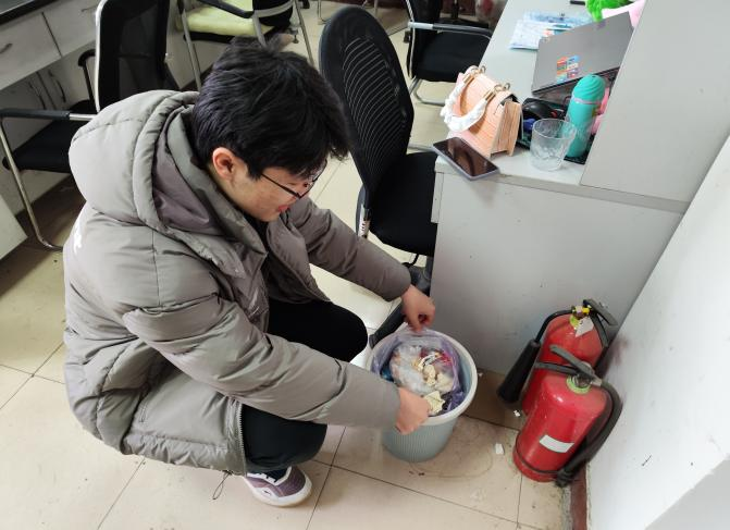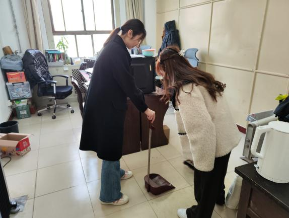 同学们领取各类劳动工具,深入班主任办公室,帮助整理物品,擦拭桌面,清空垃圾,清扫灰尘,清洁地面,并在办公室外的公共区域,及时清理垃圾,分类整理杂物。