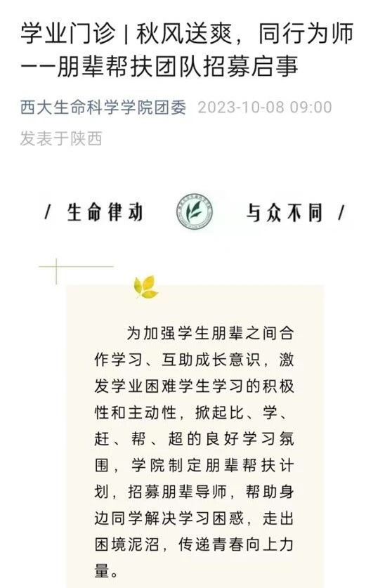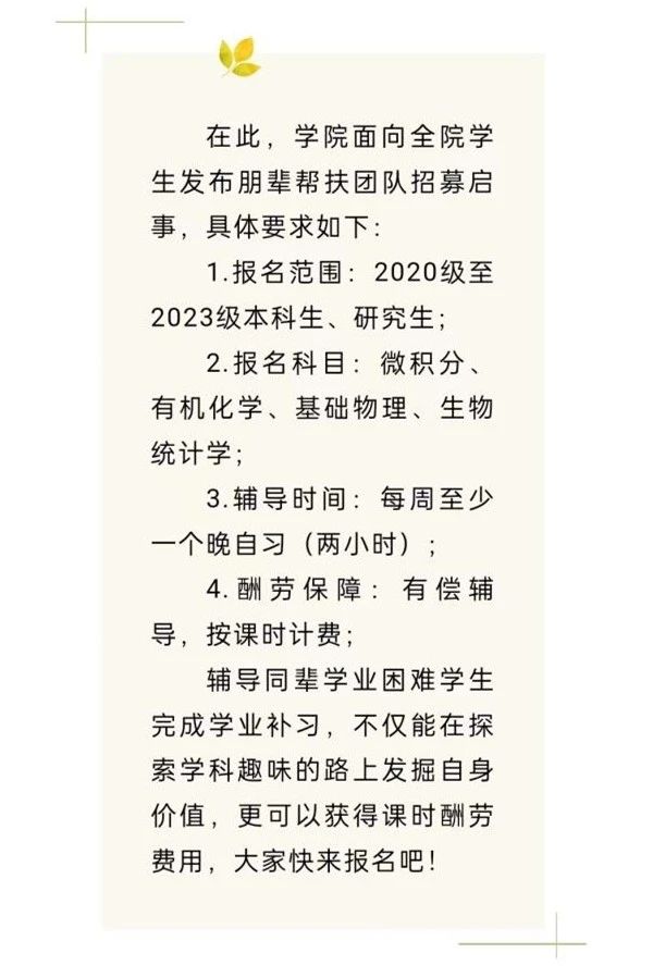 公司开展了朋辈帮扶计划,在公众号上发布朋辈帮扶团队招募信息,让朋辈导师发挥微积分、有机化学、计算机等科目特长,帮助挂科同学顺利通过重修。