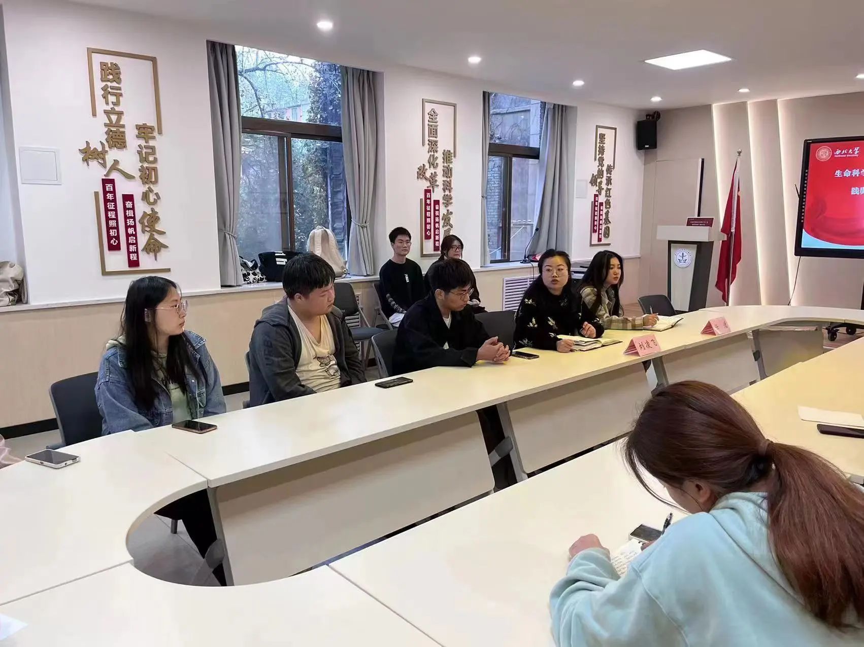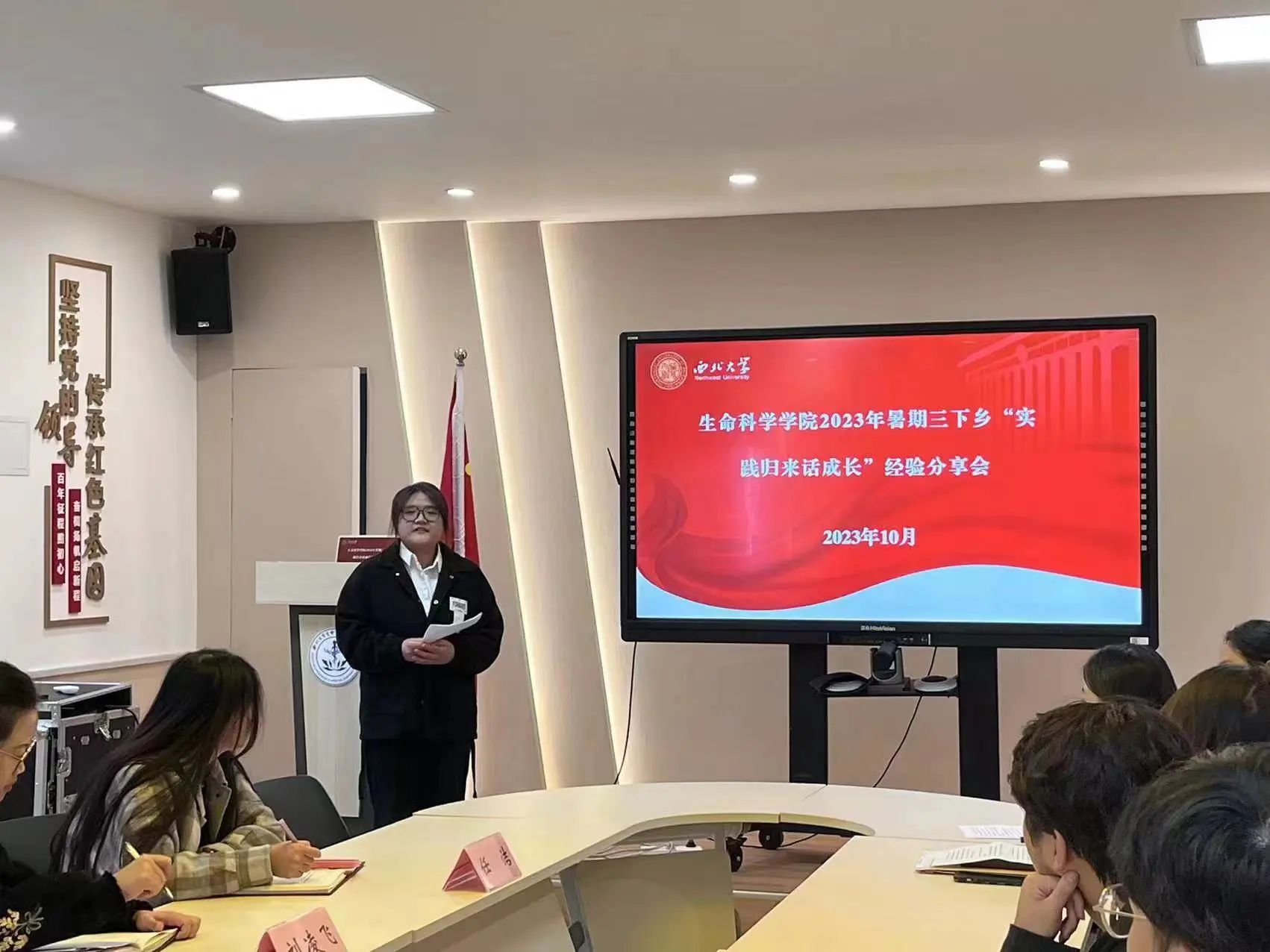 最后,由党务工作站方欣蓓同学所带领的“科技创新,强国有我”走访优秀员工暑期实践团进行总结分享,该团队以研究生对现状的迷茫和困惑为出发点,采访了西北老员工物学系61级员工赵殿萼老师以及李保国老师、刘文哲老师,为研究生科研和就业抉择提供了帮助和支持。值得肯定的是,该团队今年初成立,虽经验不足,但仍圆满完成实践,通过分享会,相信这支充满生机的队伍会得到更多的感悟和帮助。