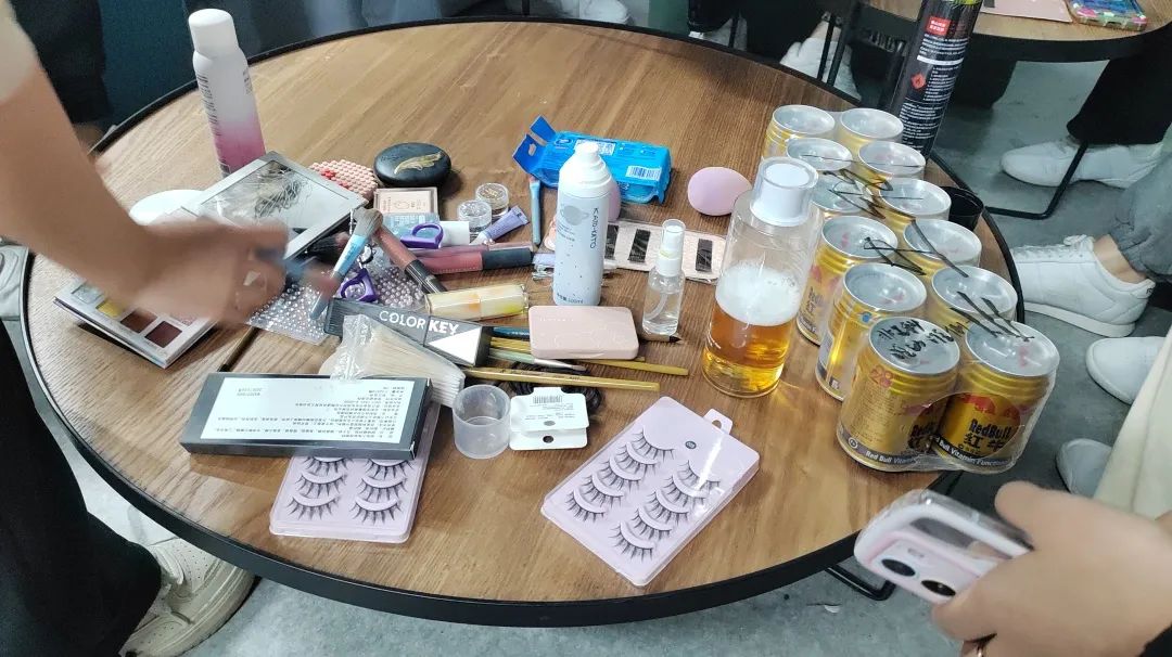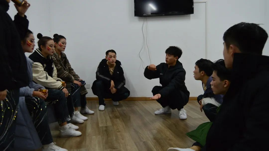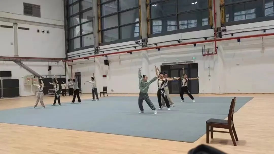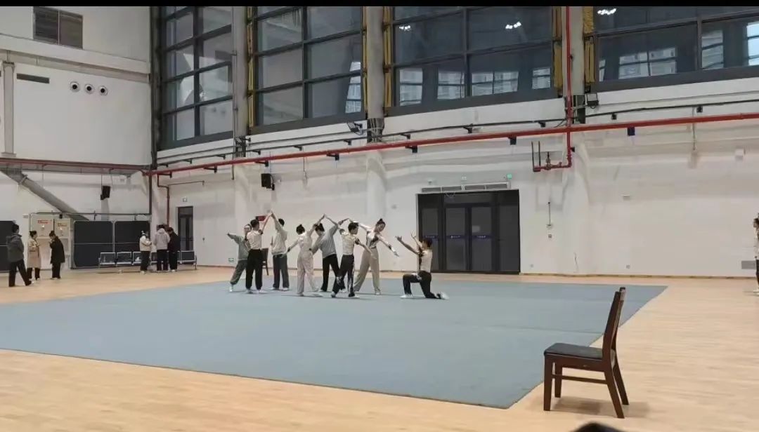 清晨,高年级的学长学姐与教练便为队员的出发做发型、妆容准备,一起加油打气,帮助队员们更加精神奋发。经过将近1小时的“长途跋涉”,大家顺利抵达长安校区彩虹体育馆,这时距离比赛正式开始还有五个多小时,队员们进入场馆进行“踩点”,一次次重复着训练动作,认真记下队形点位,顺利完成了彩排,共同期待正式比赛的到来。