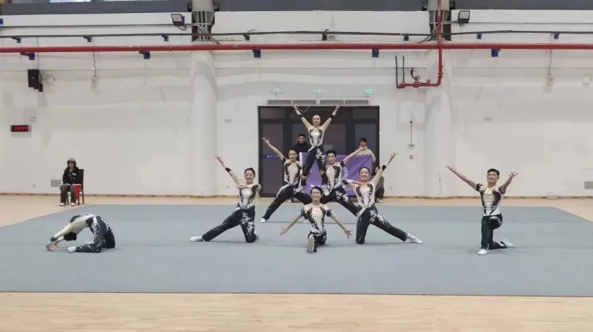 随着主持人的报幕完毕,带头人上场示意之后,八名队员便迈着整齐的步伐,洋溢着坚定的笑容上场。竞赛服上的碎钻熠熠生辉,队员脸上的油彩肆意张扬,青春洋溢的开场动作,这都无不吸引着裁判和观众的目光。背景音乐响起,大家早已胸有成竹,动作行云流水般地做下来,淋漓尽致地展示着健美操的力量美和自信美,场下欢呼声一片。