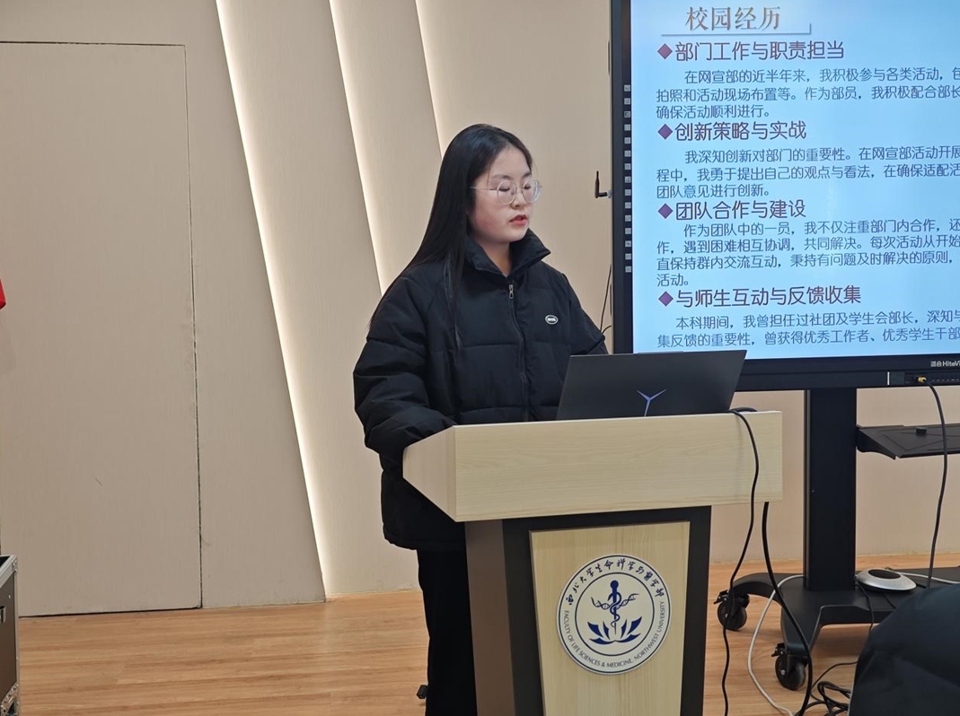 各部门员工骨干从自身特点、部门认知、工作经历以及未来工作规划等方面进行竞选演讲。竞选中,每位竞选候选人从自身角色视角出发展示了公司研究生会一学期来各项活动的精彩瞬间和取得的丰硕成果,充分展现了生科学子蓬勃向上的精神风貌。
