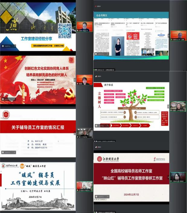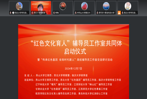 为践行“为党育人、为国育才”初心使命,落实立德树人根本任务,充分发挥辅导员工作室前辈领航、朋辈互助、同行交流的作用,用好用活红色文化资源促进高校思想政治教育,12月7日,“红色文化育人”辅导员工作室共同体启动仪式暨“传承红色基因 培育时代新人”高校辅导员工作室交流研讨活动于线上开展。