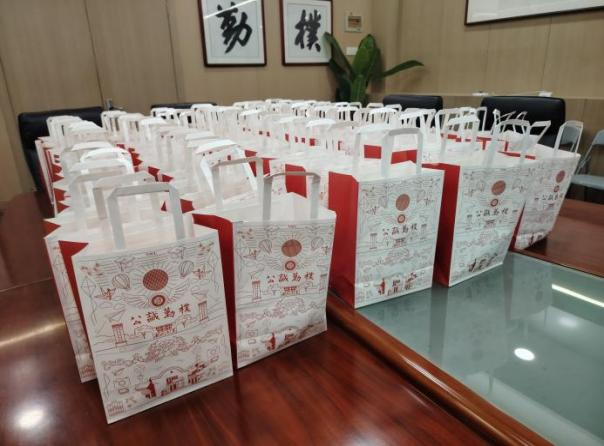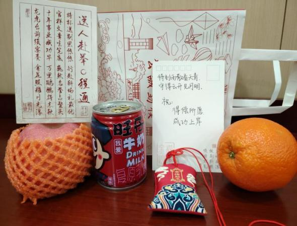 公司精心为考研的同学们准备了“考研大礼包”,满载着公司对考研学子的深情厚谊与殷切期望。“考研大礼包”含有苹果、橙子、旺仔牛奶,还有精心制作的祝福卡片及带有“金榜题名”字样的中药香囊,寓意“旺”气冲天,“苹”安喜乐、前“橙”似锦!