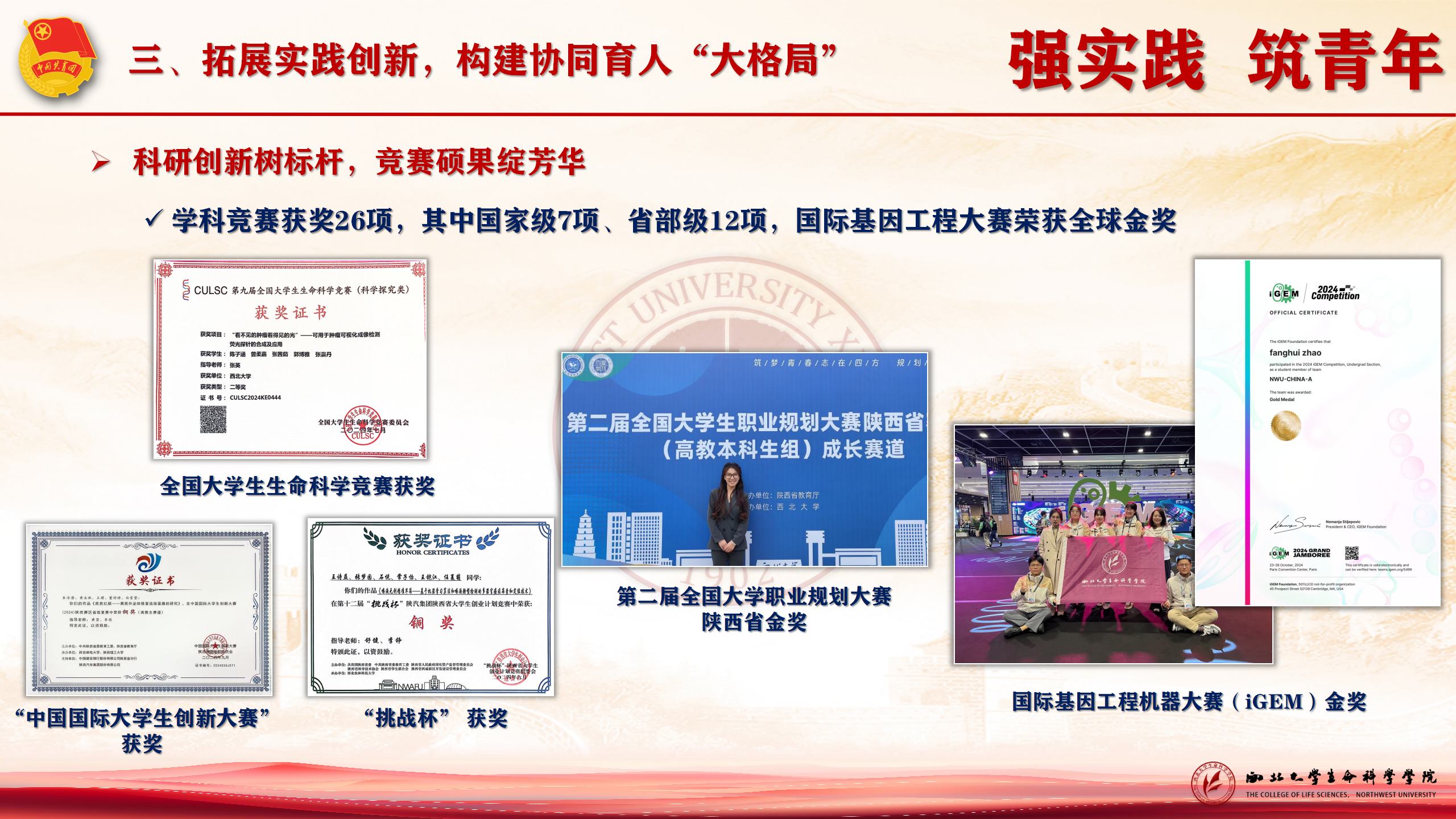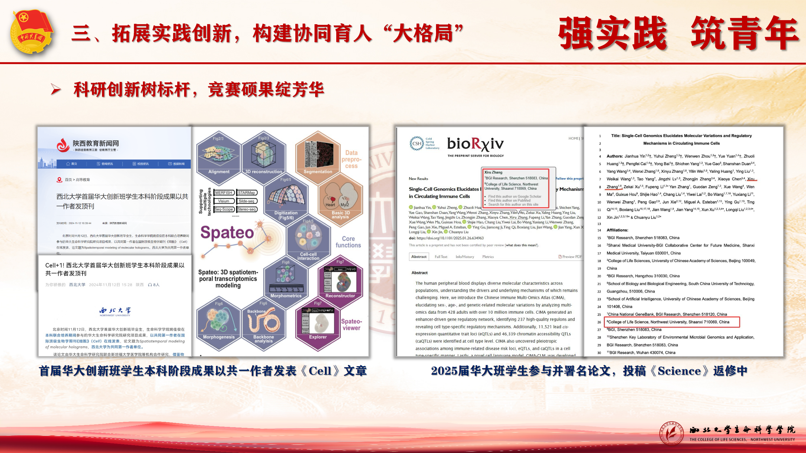 通过组织参加国际iGEM大赛、合成生物学竞赛、挑战杯等专业竞赛,提升并展现团员青年扎实的专业技能和创新能力,员工学科竞赛获奖26项,其中国际基因工程大赛荣获全球金奖,国家级7项、省部级12项;首届华大班毕业生以共同第一作者在《Cell》发表高水平论文。2021级华大班员工参与并署名论文正在进行《science》返修。