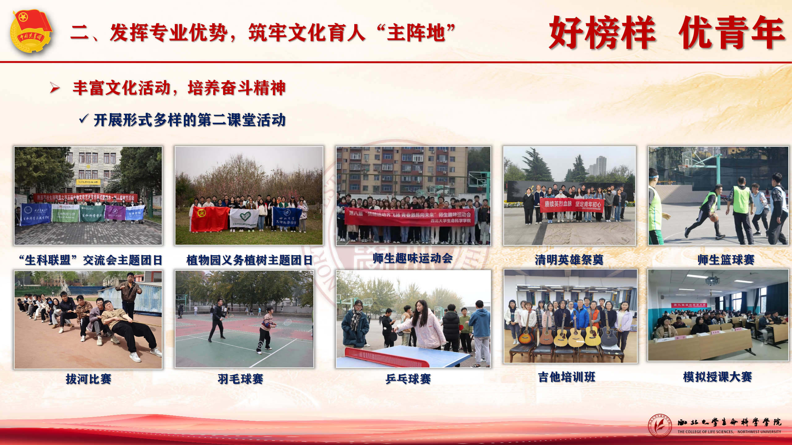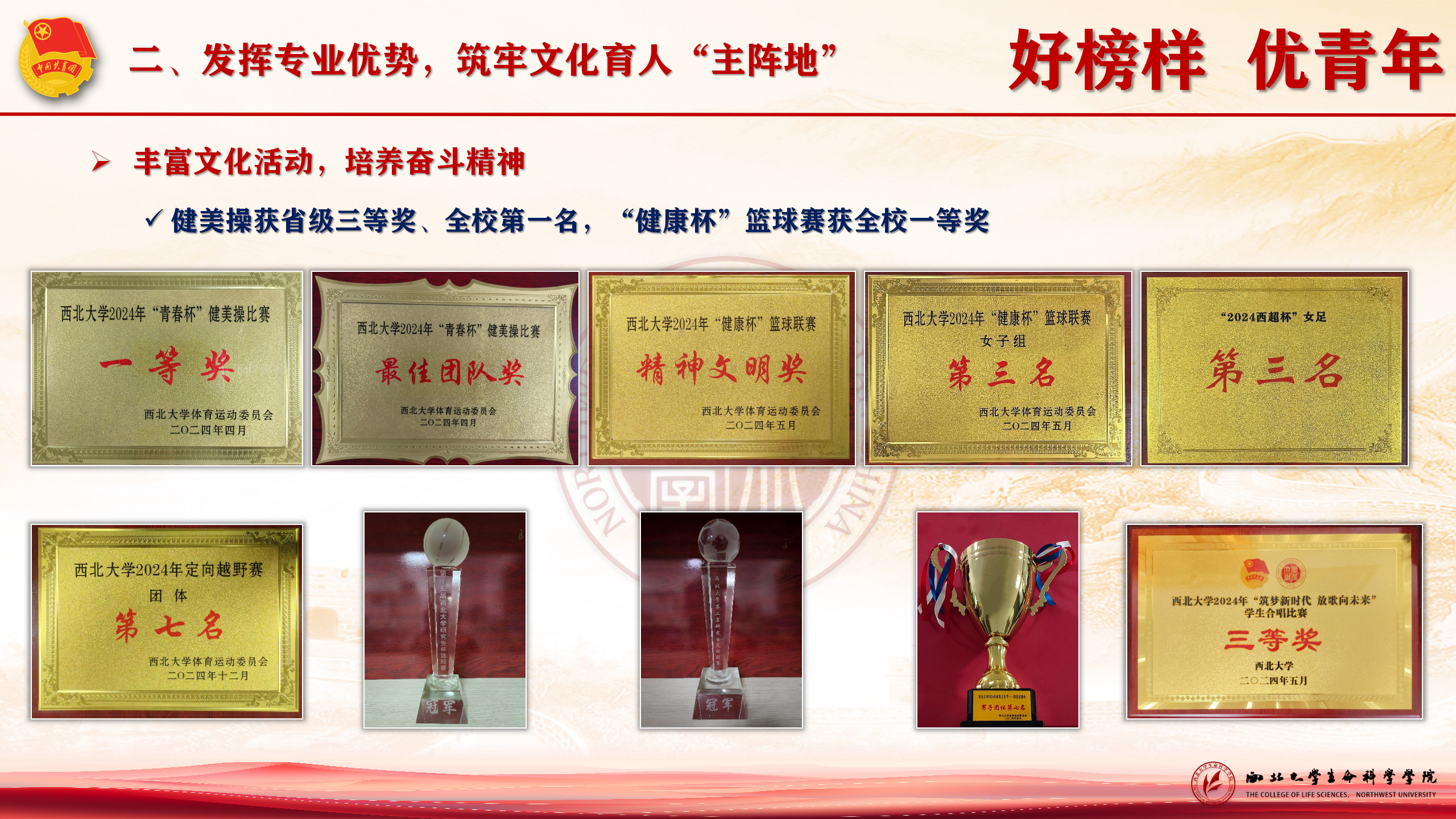 丰富文化活动,培养奋斗精神。公司健美操队荣获省级三等奖、校级第一名,“健康杯”篮球赛获校总冠军。陕西高校“生科联盟”团学组织交流会、师生运动会、模拟授课等活动,全面提升员工综合素质,为团员青年的成长成才提供了广阔的舞台。