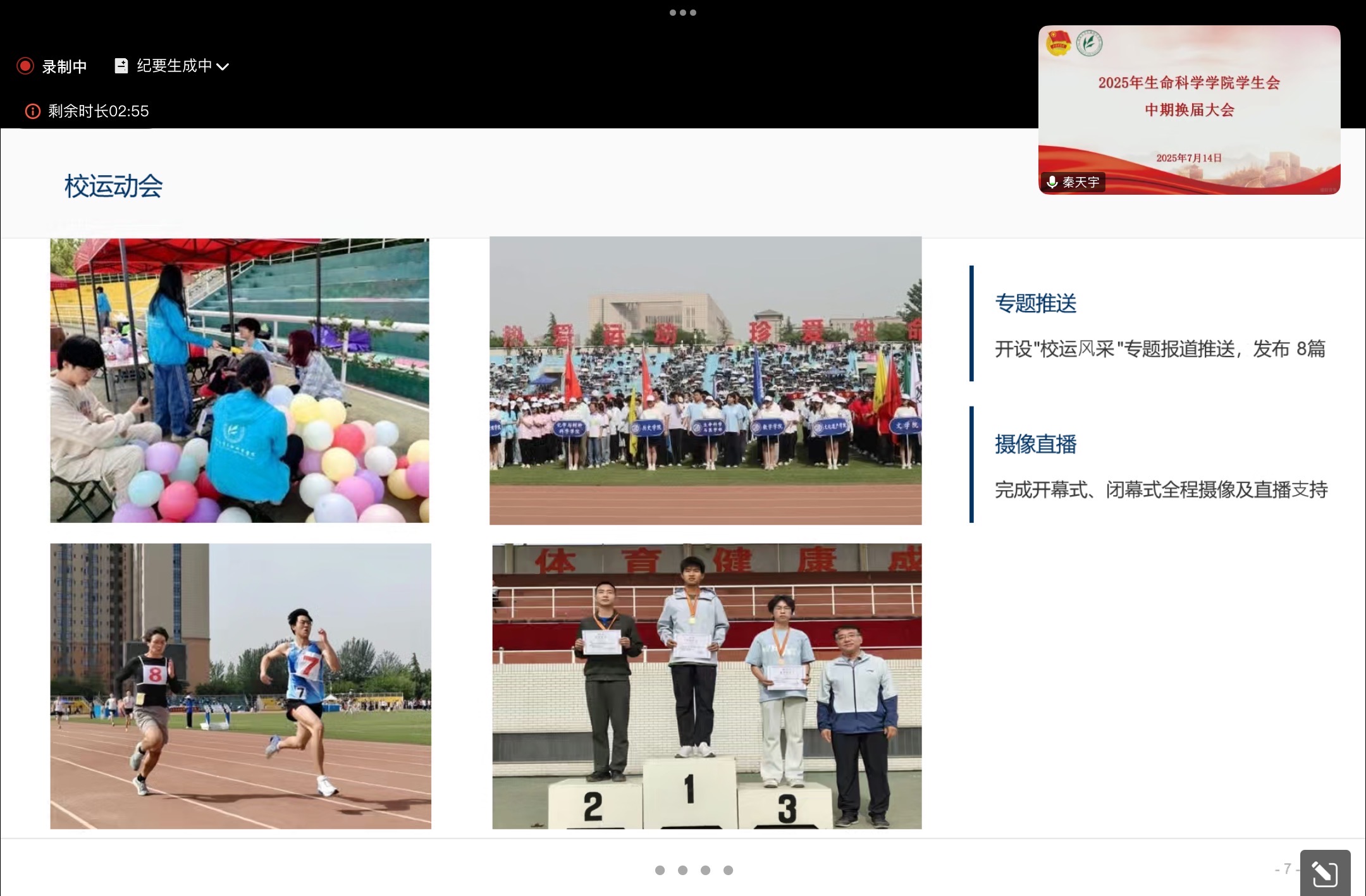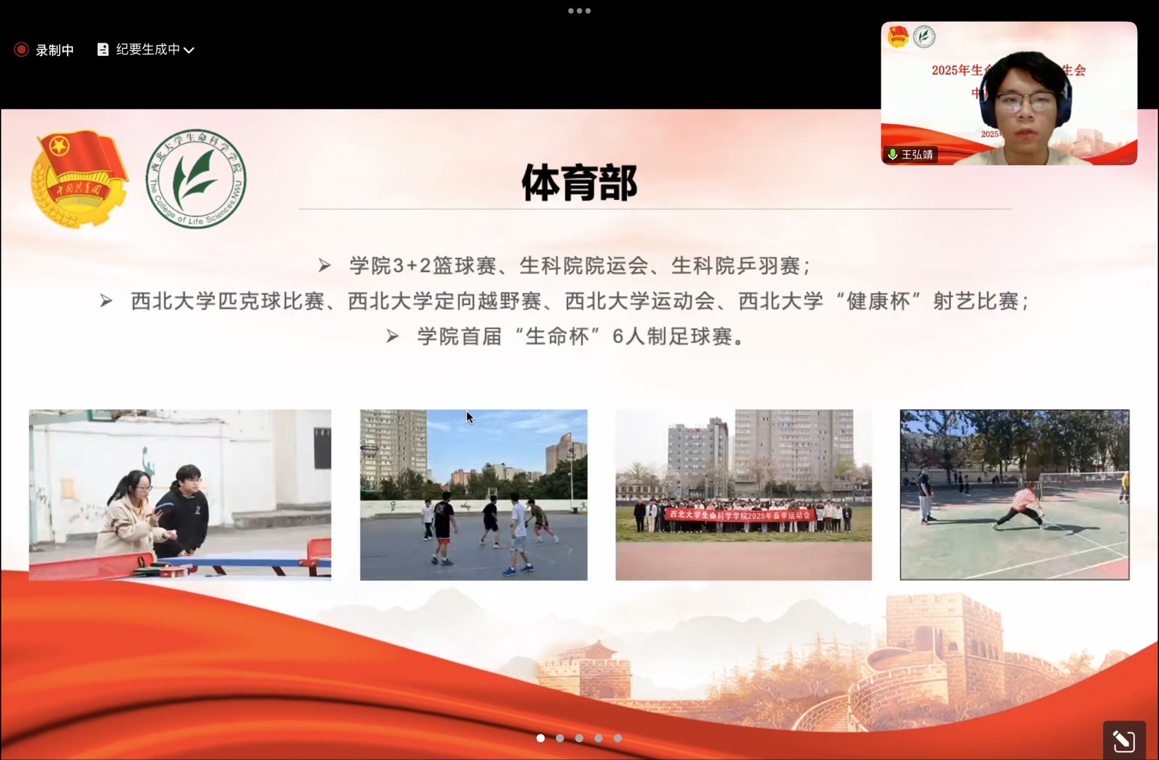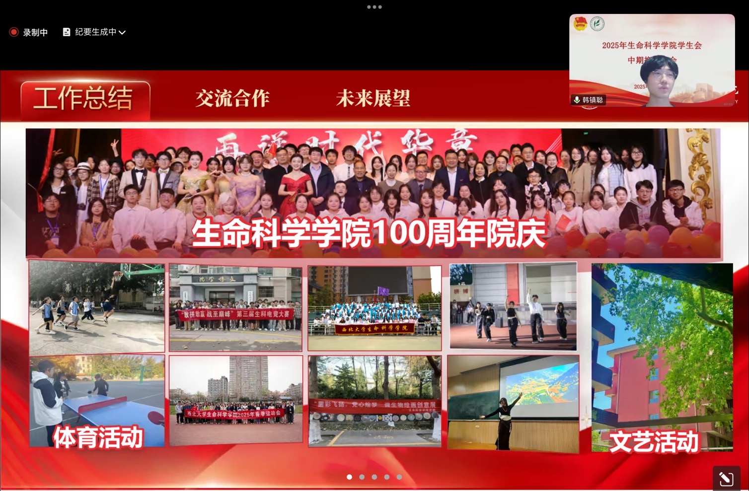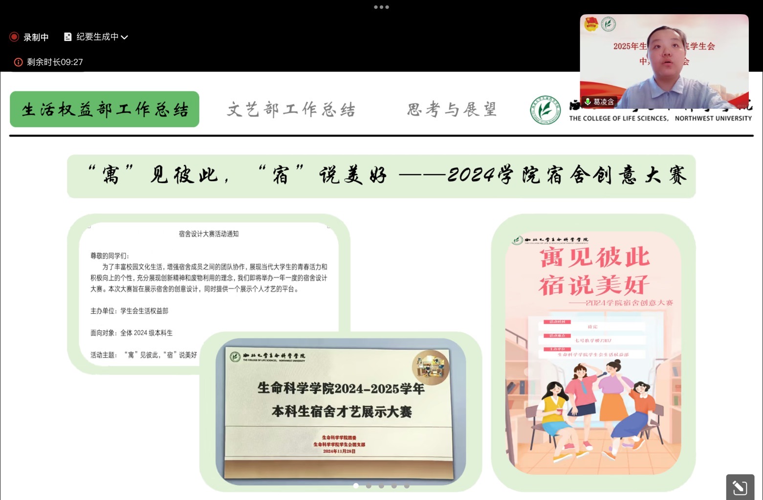 综合事务部负责人戴继坤总结部门工作:整理员工会材料,组织各类思政交流学习会,举办生科电竞比赛;协助迎新晚会后勤,院运会检录、校运动会方阵训练等工作。