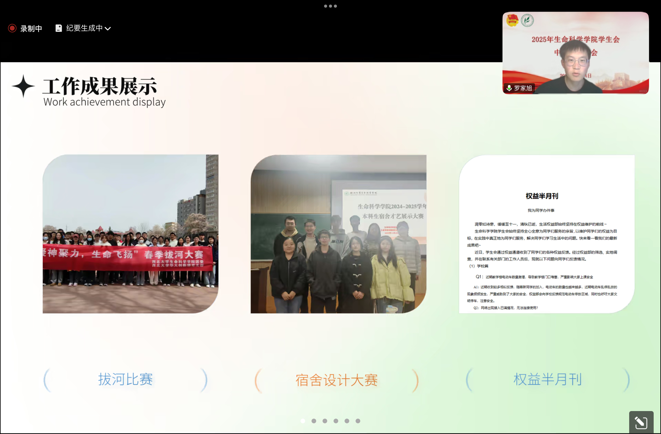 生活权益部负责人罗家旭总结部门工作:承办宿舍设计大赛,举办拔河比赛,开展权益半月刊活动。日常仓库物品调用,活动物资采集,制作长期问卷收集同学们的生活问题反馈。