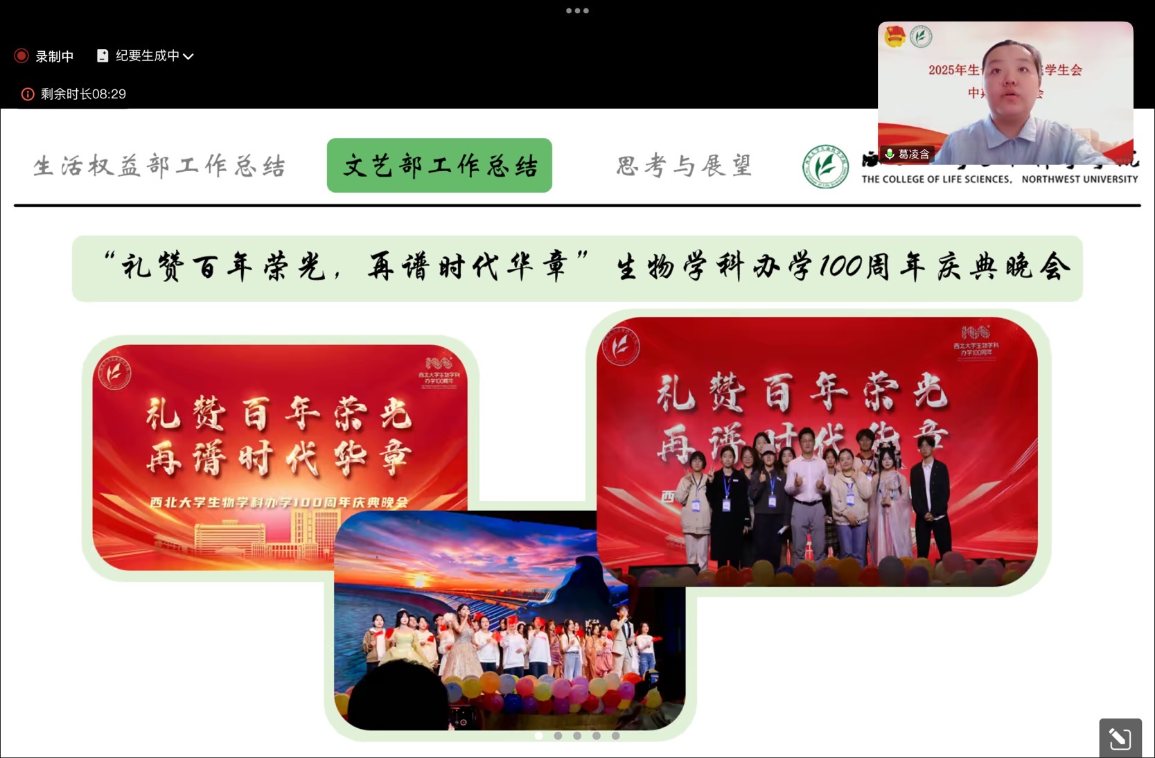 文艺部负责人葛凌含总结部门工作:组织策划举办各类文艺活动,整体表演的彩排,军训慰问演出、迎新晚会、毕业晚会、校运会30s展示等活动。