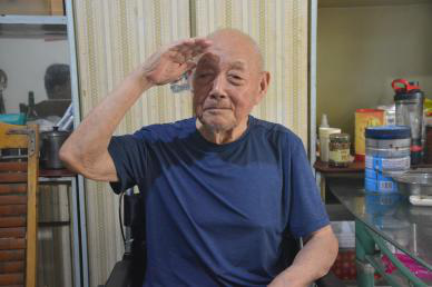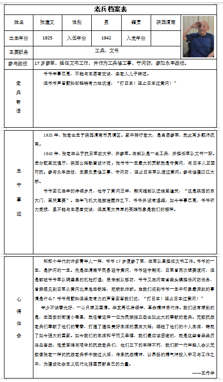 张爷爷回忆当年的峥嵘岁月,他守了黄河三年,期间随部队迁徙至潼关,“这是陕西的东大门,至关重要”。当年飞机大炮接连轰炸之下,爷爷并没有退缩;如今年事已高,爷爷听力受损,虽不能与志愿者交谈,但其高大伟岸的英雄形象是我们的榜样。