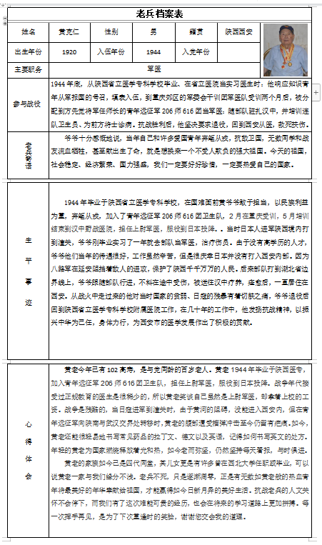 当日活动结束,由团队成员整理编写《老兵档案集》,详细记录了老兵的基本情况以及生平事迹。