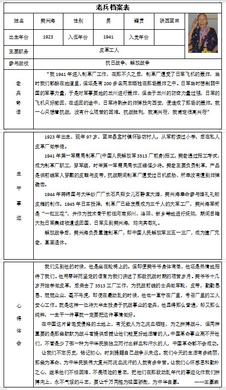 樊老1923年出生,现年97岁,蓝田县孟村镇怀珍坊村人。从军前读过小学,后在私人皮革厂做学徒。1941年第一军需局制革厂(中国人民解放军3513厂前身)招工,樊老主要负责制革,产品是供前线军人穿戴的皮鞋与皮带,抗战期间制革厂遭受过日机威胁,所幸没有遭到炸弹袭击。