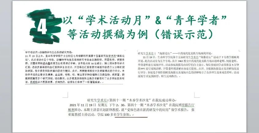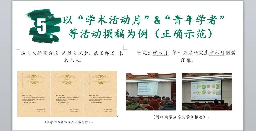 编辑部培训上,主讲人张乃予就稿件的格式要求、撰写内容、图片要求进行了详细的阐述,她以“研究生学术月”和“青年学者讲坛”活动撰稿为例,对撰稿常见问题进行了细致分析,并将稿件中时常发生的错误和修改稿件的经验分享给大家。
