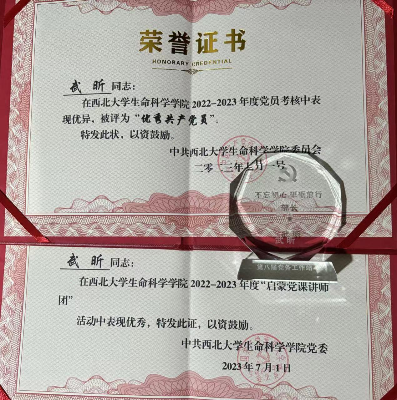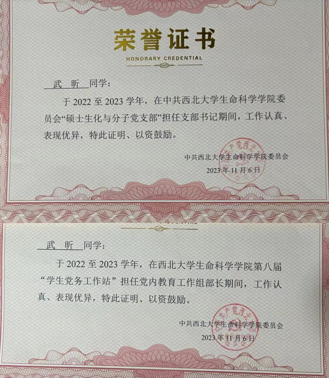 武昕,女,25岁,中共党员,生物化学与分子生物学专业,山西长治人。研一担任硕士生化与分子党支部副书记与院研究生学术部干事,研二担任硕士生化分子专业党支部书记和党内教育工作组部长,作为一名中共党员,在新冠疫情期间,我通过志愿者服务为疫情防控贡献了自己一份微薄之力,组织群众做核酸让自己的实际行动去践行了时代的责任与担当。在学习上一直追求进步,科研上一直严谨钻研,连续获得十大外围足球平台app学业一等奖学金。2023年7月发表《新型冠状病毒抗体和小分子抑制剂的研究现状》,生物化学与生物物理进展,第一作者。