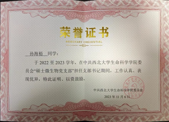 孙海裕,微生物专业,2021级硕士研究生。在校就读期间,思想端正,成绩优异,科研认真。在政治理想上,能够发挥党员先锋模范带头作用,于2023.7.1评为院级优秀共产党员。在学习科研上,2022-2023学年综合成绩位列专业第一,目前以第二作者身份在FEBS Journal(IF=5.4)上发表一篇文章,同时在投一篇一作sci,获得2023年研究生国家奖学金。在工作上,曾担任硕士微生物党支部书记以及群团服务工作组组长,组织成立“红色基因”党员服务队,积极投身志愿服务,累计义工时长超过100小时。